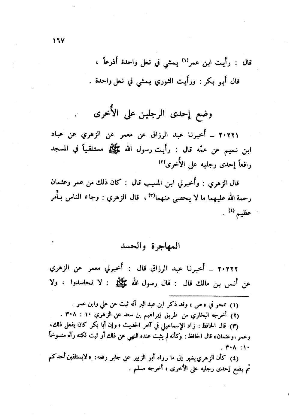 ٢٠٢٢١ - أَخْبَرَنَا عَبْدُ الرَّزَّاقِ، عَنْ مَعْمَرٍ، عَنِ الزُّهْرِيِّ، عَنْ عَبَّادِ بْنِ تَمِيمٍ، عَنْ عَمِّهِ، قَالَ: «رَأَيْتُ رَسُولَ اللَّهِ صَلَّى اللهُ عَلَيْهِ وَسَلَّمَ مُسْتَلْقِيًا فِي الْمَسْجِدِ رَافِعًا إِحْدَى رِجْلَيْهِ عَلَى الْأُخْرَى» ، قَالَ الزُّهْرِيُّ: وَأَخْبَرَنِي ابْنُ الْمُسَيِّبِ، قَالَ: «كَانَ ذَلِكَ مِنْ عُمَرَ، وَعُثْمَانَ رَحْمَةُ اللَّهُ عَلَيْهِمَا مَا لَا يُحْصَى مِنْهُمَا» ، قَالَ الزُّهْرِيُّ: «وَجَاءَ النَّاسُ بِأَمْرٍ عَظِيمٍ»