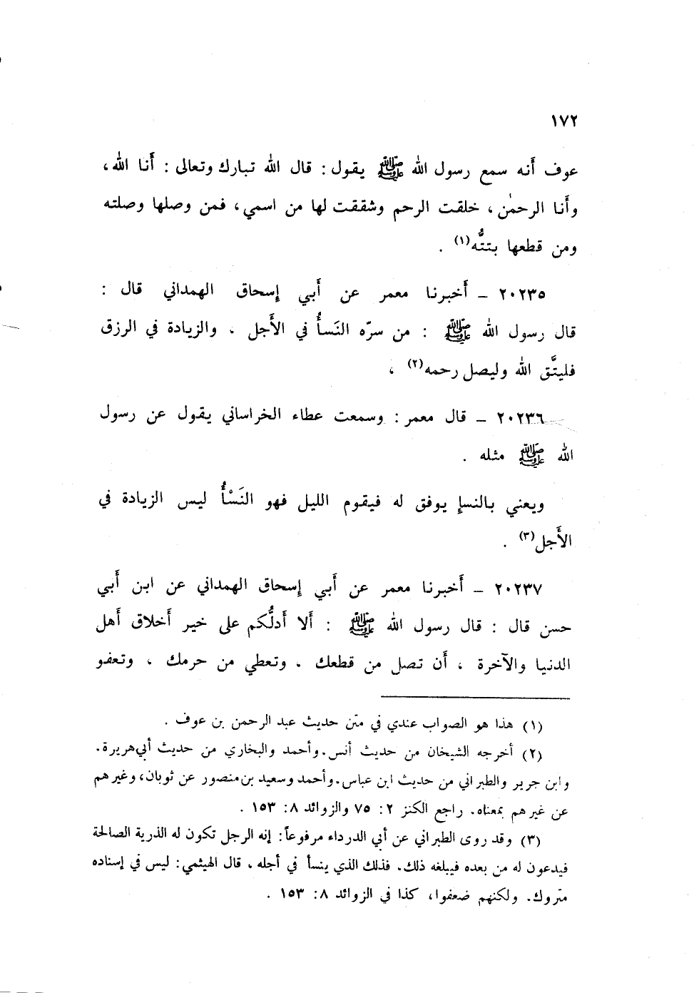 ٢٠٢٣٥ - أَخْبَرَنَا مَعْمَرٌ، عَنْ أَبِي إِسْحَاقَ الْهَمْدَانِيِّ، قَالَ: قَالَ رَسُولُ اللَّهِ صَلَّى اللهُ عَلَيْهِ وَسَلَّمَ: «مَنْ سَرَّهُ النَّسْأُ فِي الْأَجَلِ، وَالزِّيَادَةُ فِي الرِّزْقِ فَلْيَتَّقِ اللَّهَ، وَلْيَصِلْ رَحِمَهُ»