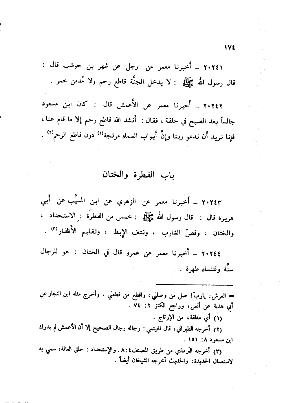 ٢٠٢٤٢ - أَخْبَرَنَا مَعْمَرٌ، عَنِ الْأَعْمَشِ، قَالَ: كَانَ ابْنُ مَسْعُودٍ جَالِسًا بَعْدَ الصُّبْحِ فِي حَلْقَةٍ، فَقَالَ: «أَنْشُدُ اللَّهَ قَاطِعَ رَحِمٍ إِلَّا مَا قَامَ عَنَّا، فَإِنَّا نُرِيدُ أَنْ نَدْعُوَ رَبَّنَا، وَإِنَّ أَبْوَابَ السَّمَاءِ مُرْتَجَةٌ دُونَ قَاطِعِ الرَّحِمِ»