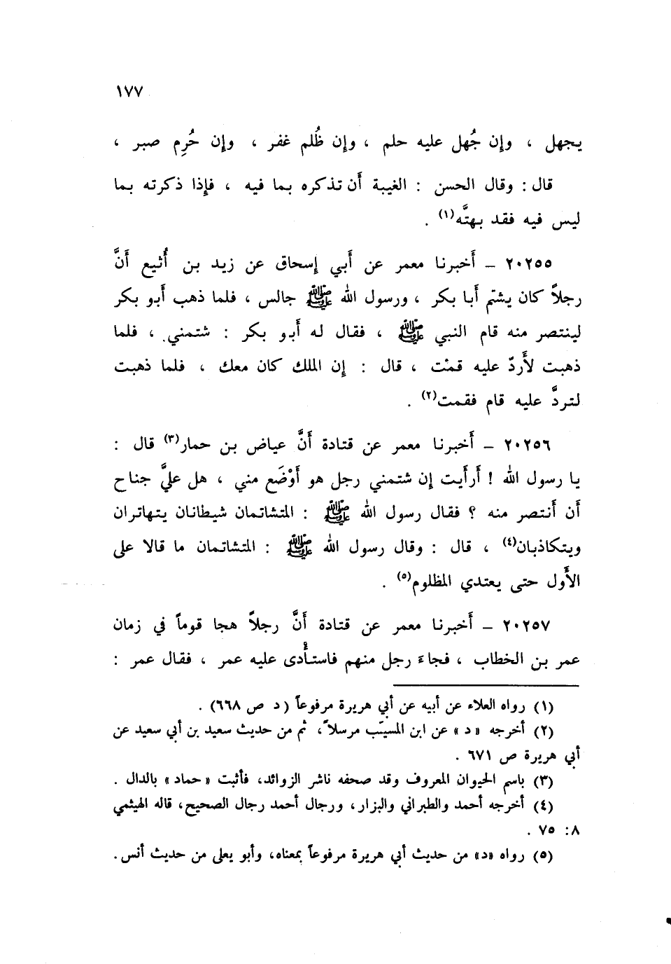 ٢٠٢٥٦ - أَخْبَرَنَا مَعْمَرٌ، عَنْ قَتَادَةَ، أَنَّ عِيَاضَ بْنَ حِمَارٍ، قَالَ: يَا رَسُولَ اللَّهِ، أَرَأَيْتَ إِنْ شَتَمَنِي رَجُلٌ هُوَ أَوْضَعُ مِنِّي هَلْ عَلَيَّ جُنَاحٌ أَنْ أَنْتَصِرَ مِنْهُ؟ فَقَالَ رَسُولُ اللَّهِ صَلَّى اللهُ عَلَيْهِ وَسَلَّمَ: «الْمُتَشَاتِمَانِ شَيْطَانَانِ يَتَهَاتَرَانِ وَيَتَكَاذَبَانِ»