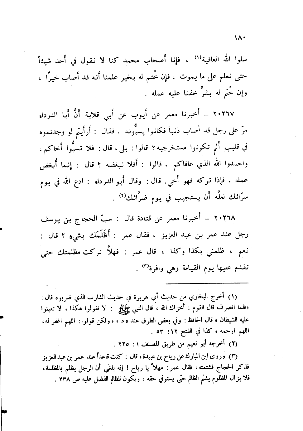 ٢٠٢٦٧ - أَخْبَرَنَا مَعْمَرٌ، عَنْ أَيُّوبَ، عَنْ أَبِي قِلَابَةَ، أَنَّ أَبَا الدَّرْدَاءِ مَرَّ عَلَى رَجُلٍ قَدْ أَصَابَ ذَنْبًا، فَكَانُوا يَسُبُّونَهُ، فَقَالَ: «أَرَأَيْتُمْ لَوْ وَجَدْتُمُوهُ فِي قَلِيبٍ أَلَمْ تَكُونُوا مُسْتخْرِجِيهِ؟» ، قَالُوا: بَلَى، قَالَ: «فَلَا تَسُبُّوا أَخَاكُمْ وَاحْمَدُوا اللَّهَ الَّذِي عَافَاكُمْ» ، قَالُوا: أَفَلَا تَبْغَضُهُ؟ قَالَ: «إِنَّمَا أَبْغَضُ عَمَلَهُ، فَإِذَا تَرَكَهُ فَهُوَ أَخِي» ، قَالَ: وَقَالَ أَبُو الدَّرْدَاءِ: «ادْعُ اللَّهَ فِي يَوْمِ سَرَّائِكَ لَعَلَّهُ أَنْ يَسْتَجِيبَ فِي يَوْمِ ضَرَّائِكَ»