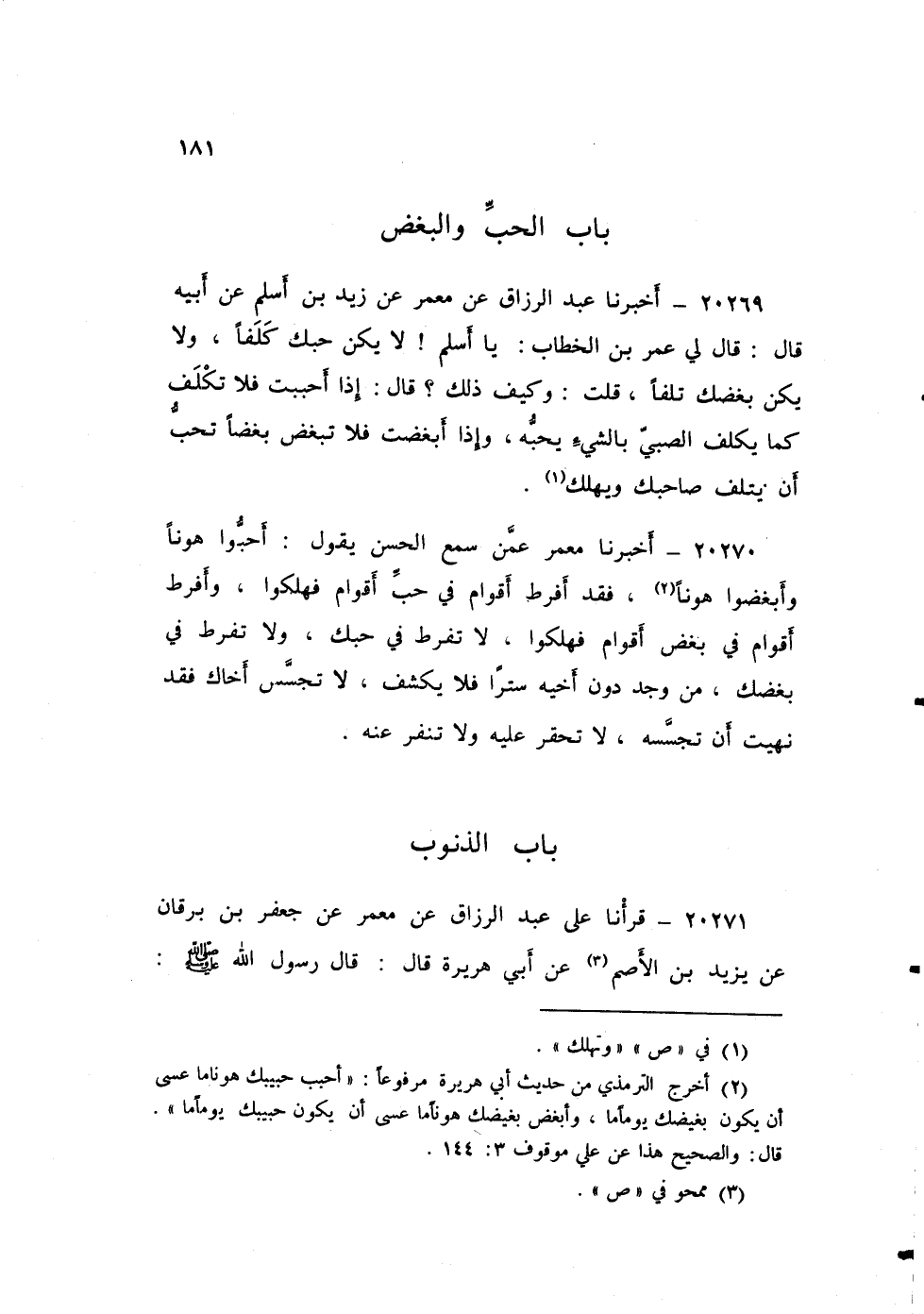 ٢٠٢٦٩ - أَخْبَرَنَا عَبْدُ الرَّزَّاقِ، عَنْ مَعْمَرٍ، عَنْ زَيْدِ بْنِ أَسْلَمَ، عَنْ أَبِيهِ، قَالَ: قَالَ لِي عُمَرُ بْنُ الْخَطَّابِ: «يَا أَسْلَمُ لَا يَكُنْ حُبُّكَ كَلَفًا، وَلَا يَكُنْ بُغْضُكَ تَلَفًا» ، قُلْتُ: وَكَيْفَ ذَلِكَ؟ قَالَ: «إِذَا أَحْبَبْتَ فَلَا تَكْلَفْ كَمَا يَكْلَفُ الصَّبِيُّ بِالشَّيْءِ يُحِبُّهُ، وَإِذَا أَبْغَضْتَ فَلَا تَبْغَضْ بُغْضًا تُحِبُّ أَنْ يَتْلَفَ صَاحِبُكَ وَيَهْلِكَ»