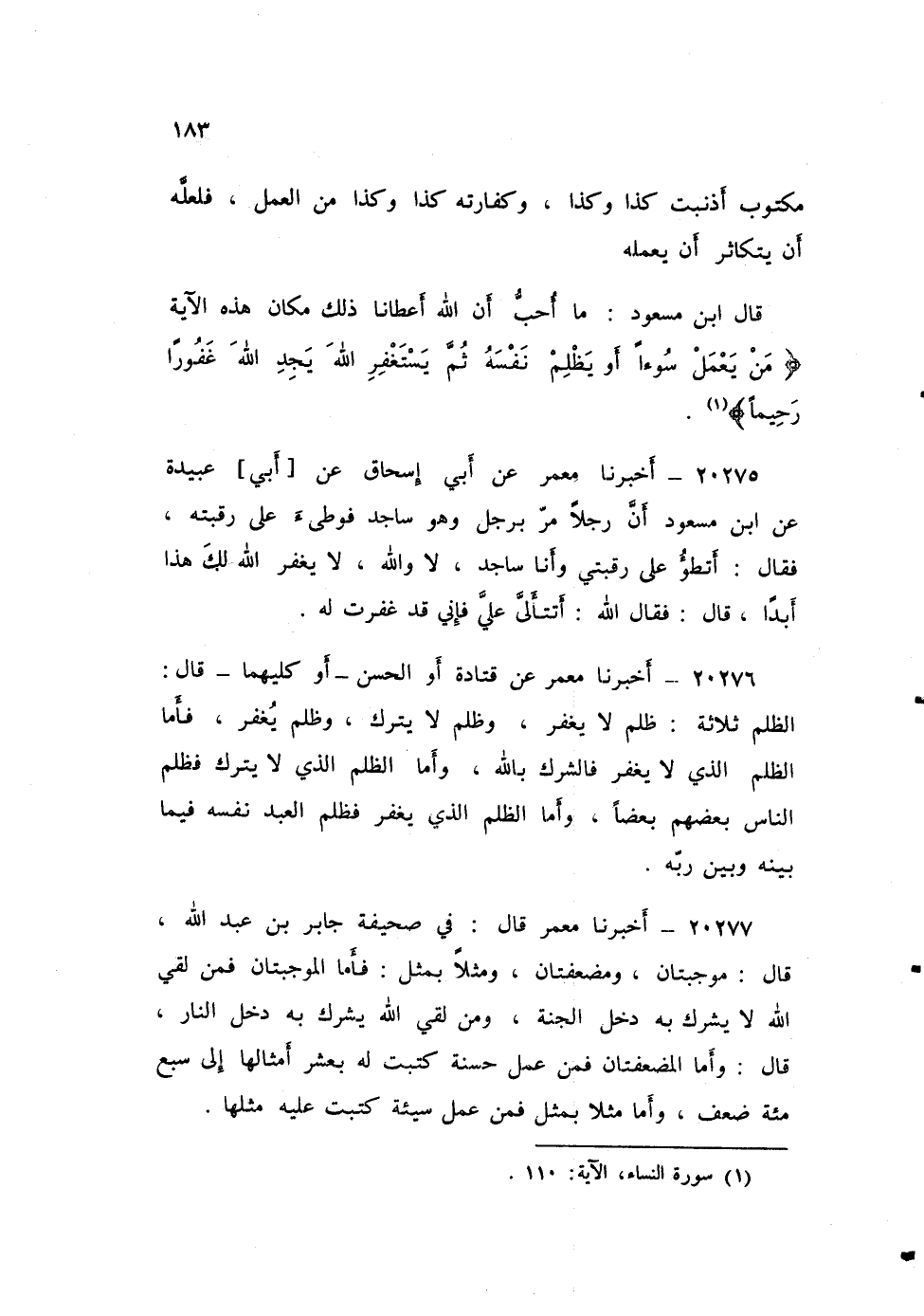 ٢٠٢٧٦ - أَخْبَرَنَا مَعْمَرٌ، عَنْ قَتَادَةَ، أَوِ الْحَسَنِ أَوْ كِلَيْهِمَا، قَالَ: «الظُّلْمُ ثَلَاثَةٌ: ظُلْمٌ لَا يُغْفَرُ، وَظُلْمٌ لَا يُتْرَكُ، وَظُلْمٌ يُغْفَرُ، فَأَمَّا الظُّلْمُ الَّذِي لَا يُغْفَرُ: فَالشِّرْكُ بِاللَّهِ، وَأَمَّا الظُّلْمُ الَّذِي لَا يُتْرَكُ: فَظُلْمُ النَّاسِ بَعْضِهِمْ بَعْضًا، وَأَمَّا الظُّلْمُ الَّذِي يُغْفَرُ: فَظُلْمُ الْعَبْدِ نَفْسَهُ فِيمَا بَيْنَهُ وَبَيْنَ رَبِّهِ»