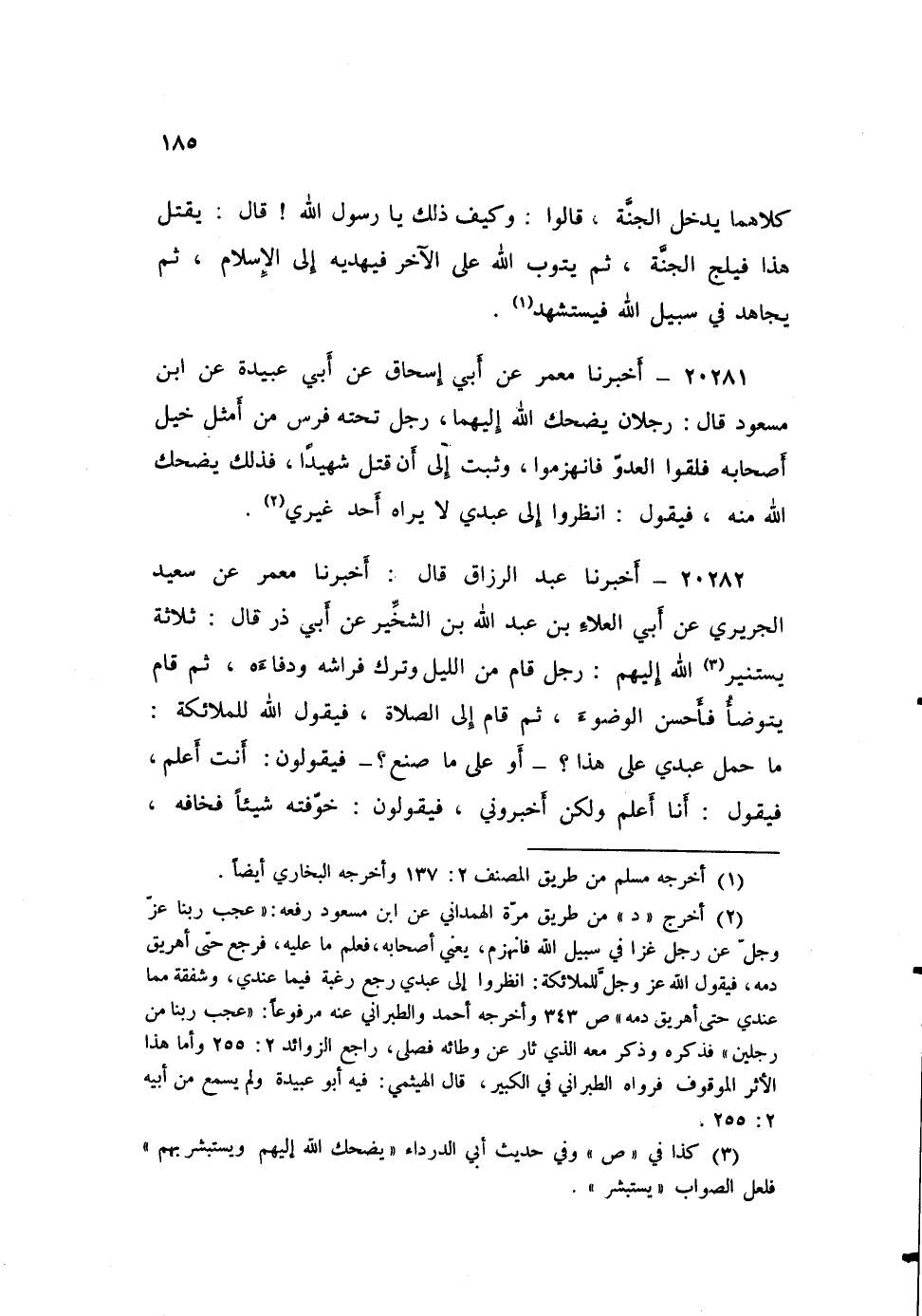 ٢٠٢٨١ - أَخْبَرَنَا مَعْمَرٌ، عَنْ أَبِي إِسْحَاقَ، عَنْ أَبِي عُبَيْدَةَ، عَنِ ابْنِ مَسْعُودٍ، قَالَ: «رَجُلَانِ يَضْحَكُ اللَّهُ إِلَيْهِمَا: رَجُلٌ تَحْتَهُ فَرَسٌ مِنْ أَمْثَلِ خَيْلِ أَصْحَابِهِ فَلَقُوا الْعَدُوَّ فَانْهَزَمُوا، وَثَبَتْ إِلَى أَنْ قُتِلَ شَهِيدًا، فَذَلِكَ يَضْحَكُ اللَّهُ مِنْهُ، فَيَقُولُ: انْظُرُوا إِلَى عَبْدِي لَا يَرَاهُ أَحَدٌ غَيْرِي»