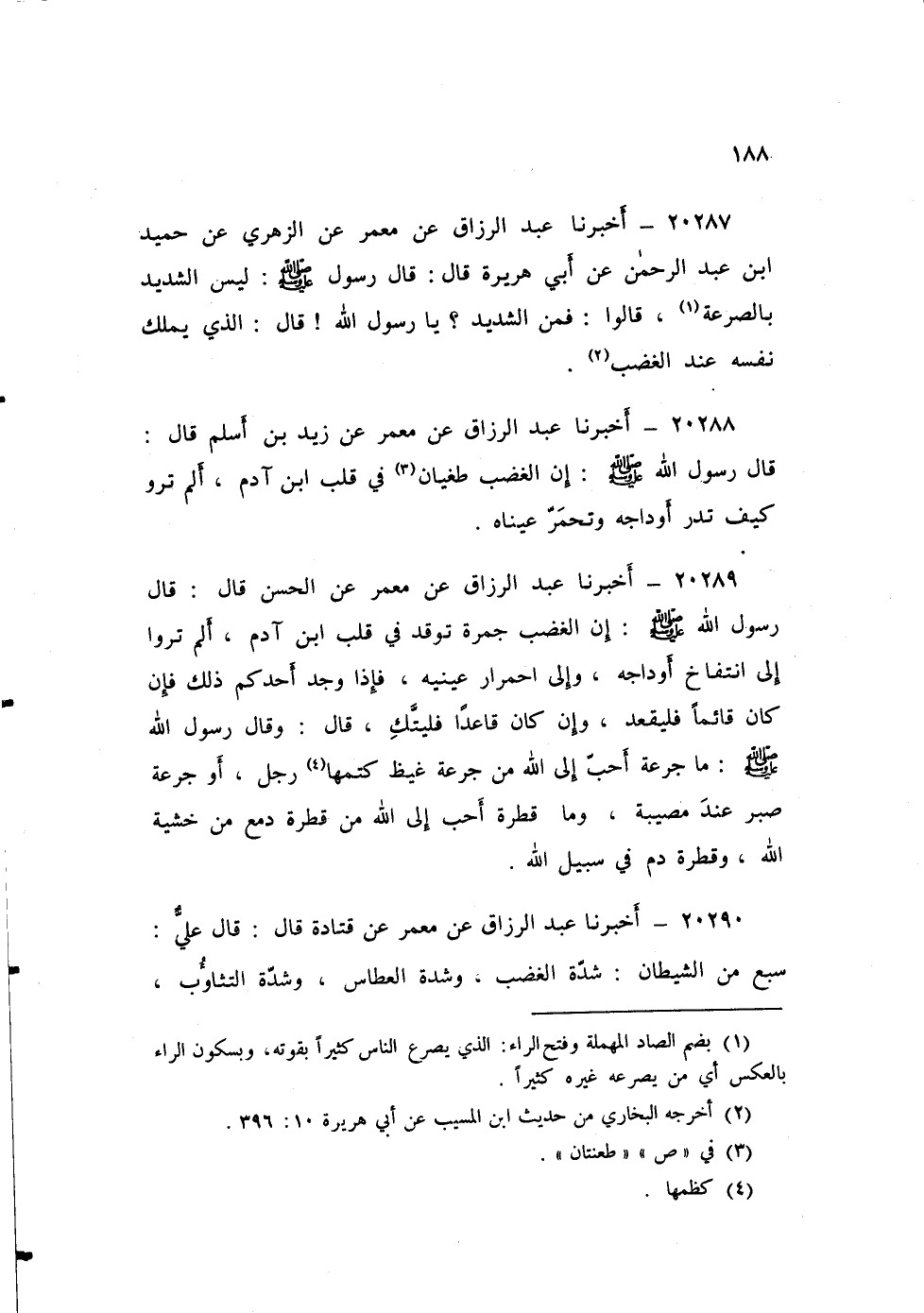 ٢٠٢٨٧ - أَخْبَرَنَا عَبْدُ الرَّزَّاقِ، عَنْ مَعْمَرٍ، عَنِ الزُّهْرِيِّ، عَنْ حُمَيْدِ بْنِ عَبْدِ الرَّحْمَنِ، عَنْ أَبِي هُرَيْرَةَ، قَالَ: قَالَ رَسُولُ اللَّهِ صَلَّى اللهُ عَلَيْهِ وَسَلَّمَ: «لَيْسَ الشَّدِيدُ بِالصُّرَعَةِ» ، قَالُوا: مَنِ الشَّدِيدُ يَا رَسُولَ اللَّهِ؟ قَالَ: «الَّذِي يَمْلِكُ نَفْسَهُ عِنْدَ الْغَضَبِ»