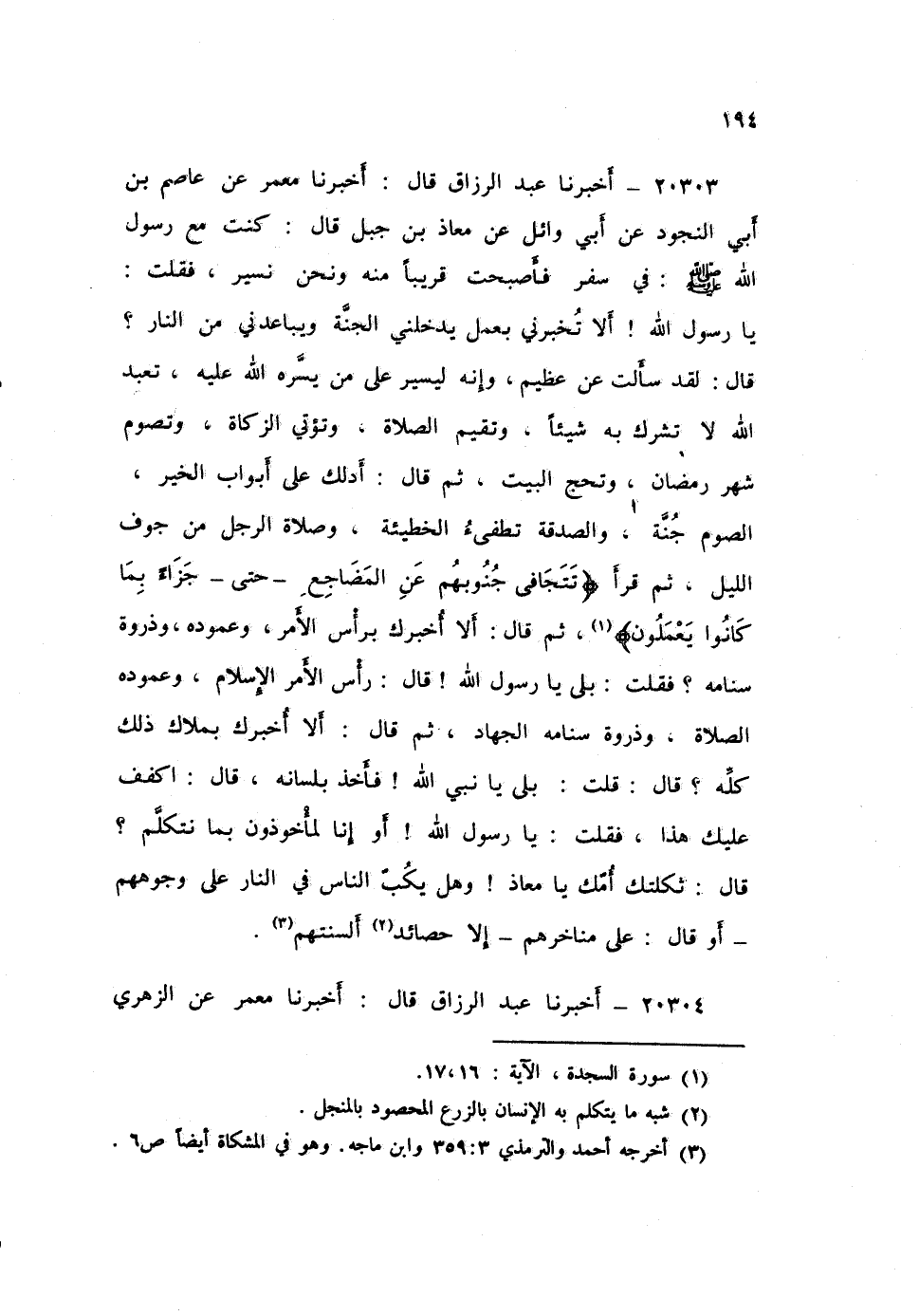 ٢٠٣٠٣ - أَخْبَرَنَا عَبْدُ الرَّزَّاقِ، قَالَ أَخْبَرَنَا مَعْمَرٌ، عَنْ عَاصِمِ بْنِ أَبِي النَّجُودِ، عَنْ أَبِي وَائِلٍ، عَنْ مُعَاذِ بْنِ جَبَلٍ، قَالَ: كُنْتُ مَعَ رَسُولِ اللَّهِ صَلَّى اللهُ عَلَيْهِ وَسَلَّمَ فِي سَفَرٍ، فَأَصْبَحْتُ قَرِيبًا مِنْهُ وَنَحْنُ نَسِيرُ، فَقُلْتُ: يَا رَسُولَ اللَّهِ، أَلَا تُخْبِرُنِي بِعَمَلٍ يُدْخِلُنِي الْجَنَّةَ، وَيُبَاعِدُنِي مِنَ النَّارِ، قَالَ: «لَقَدْ سَأَلْتَ عَنْ عَظِيمٍ، وَإِنَّهُ لَيَسِيرٌ عَلَى مَنْ يَسَّرَهُ اللَّهُ عَلَيْهِ، تَعْبُدُ اللَّهَ لَا تُشْرِكُ بِهِ شَيْئًا، وَتُقِيمُ الصَّلَاةَ، وَتُؤْتِي الزَّكَاةَ، وَتَصُومُ شَهْرَ رَمَضَانَ، وَتَحُجُّ الْبَيْتَ» ثُمَّ قَالَ: «أَدُلُّكَ عَلَى أَبْوَابِ الْخَيْرِ: الصَّوْمُ جُنَّةٌ، وَالصَّدَقَةُ تُطْفِئُ الْخَطِيئَةَ، وَصَلَاةُ الرَّجُلِ مِنْ جَوْفِ اللَّيْلِ، ثُمَّ قَرَأَ: {تَتَجَافَى جُنُوبُهُمْ عَنِ الْمَضَاجِعِ} [السجدة: ١٦]- حَتَّى - {جَزَاءً بِمَا كَانُوا يَعْمَلُونَ} [السجدة: ١٧] ثُمَّ قَالَ: أَلَا أُخْبِرُكَ بِرَأْسِ الْأَمْرِ وَعَمُودِهِ وَذِرْوَةِ سَنَامِهِ؟» ، فَقُلْتُ: بَلَى يَا رَسُولَ اللَّهِ، قَالَ: رَأْسُ الْأَمْرِ الْإِسْلَامُ، وَعَمُودُهُ الصَّلَاةُ، وَذِرْوَةُ سَنَامِهِ الْجِهَادُ «ثُمَّ قَالَ:» أَلَا أُخْبِرُكَ بِمِلَاكِ ذَلِكَ كُلِّهِ؟ «، قَالَ: قُلْتُ: بَلَى يَا نَبِيَّ اللَّهِ، فَأَخَذَ بِلِسَانِهِ قَالَ:» اكْفُفْ عَلَيْكَ هَذَا «، فَقُلْتُ: يَا رَسُولَ اللَّهِ، أَوَإِنَّا لَمَأْخُوذُونَ بِمَا نَتَكَلَّمُ؟ قَالَ:» ثَكِلَتْكَ أُمُّكَ يَا مُعَاذُ، وَهَلْ يُكِبُّ النَّاسَ فِي النَّارِ عَلَى وُجُوهِهِمْ - أَوْ قَالَ: عَلَى مَنَاخِرِهِمْ - إِلَّا حَصَائِدُ أَلْسِنَتِهِمْ "