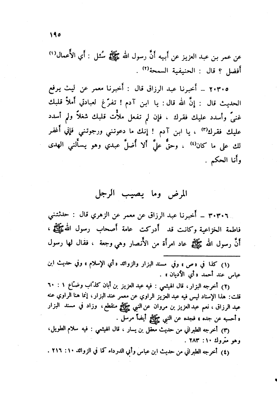 ٢٠٣٠٥ - أَخْبَرَنَا عَبْدُ الرَّزَّاقِ، قَالَ أَخْبَرَنَا مَعْمَرٌ، عَنْ لَيْثٍ يَرْفَعُ الْحَدِيثَ قَالَ: «إِنَّ اللَّهَ قَالَ: يَا ابْنَ آدَمَ تَفَرَّغْ لِعِبَادَتِي أَمْلَأْ قَلْبَكَ غِنًى، وَأَسْدُدْ عَلَيْكَ فَقْرَكَ، فَإِنْ لَمْ تَفْعَلْ مَلَأْتُ قَلْبَكَ شُغْلًا وَلَمْ أَسْدُدْ عَلَيْكَ فَقْرَكَ، يَا ابْنَ آدَمَ إِنَّكَ مَا دَعَوْتَنِي وَرَجَوْتَنِي، فَإِنِّي أَغْفِرُ لَكَ عَلَى مَا كَانَ، وَحَقٌّ عَلَيَّ أَلَّا أُضِلَّ عَبْدِي وَهُوَ يَسْأَلُنِي الْهُدَى، وَأَنَا الْحَكَمُ»