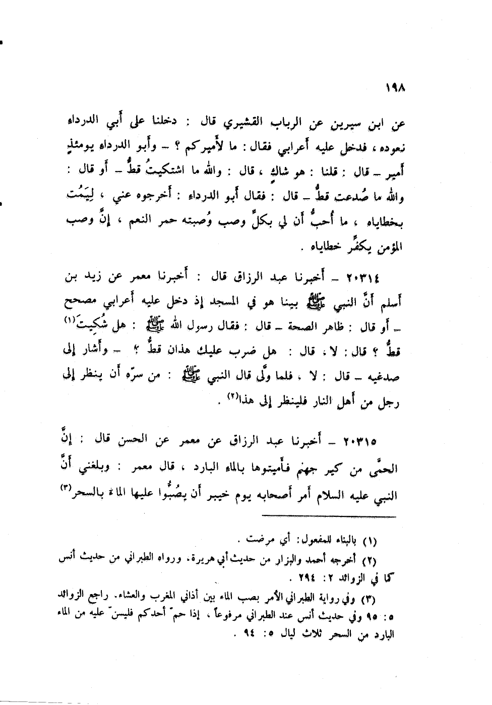 ٢٠٣١٤ - أخبرنا عبد الرزاق قال أخبرنا معمر عَنْ زَيْدِ بْنِ أَسْلَمَ، أَنَّ النَّبِيَّ صَلَّى اللهُ عَلَيْهِ وَسَلَّمَ بَيْنَا هُوَ فِي الْمَسْجِدِ إِذْ دَخَلَ عَلَيْهِ أَعْرَابِيٌّ مُصَحَّحٌ - أَوْ قَالَ: ظَاهِرُ الصِّحَّةِ - قَالَ: فَقَالَ رَسُولُ اللَّهِ صَلَّى اللهُ عَلَيْهِ وَسَلَّمَ: «هَلْ شَكَيْتَ قَطُّ؟» ، قَالَ: لَا، قَالَ: «هَلْ ضَرَبَ عَلَيْكَ هَذَانِ قَطُّ؟» - وَأَشَارَ إِلَى صُدْغَيْهِ - قَالَ: لَا، فَلَمَّا وَلَّى قَالَ النَّبِيُّ صَلَّى اللهُ عَلَيْهِ وَسَلَّمَ: «مَنْ سَرَّهُ أَنْ يَنْظُرَ إِلَى رَجُلٍ مِنْ أَهْلِ النَّارِ فَلْيَنْظُرْ إِلَى هَذَا»