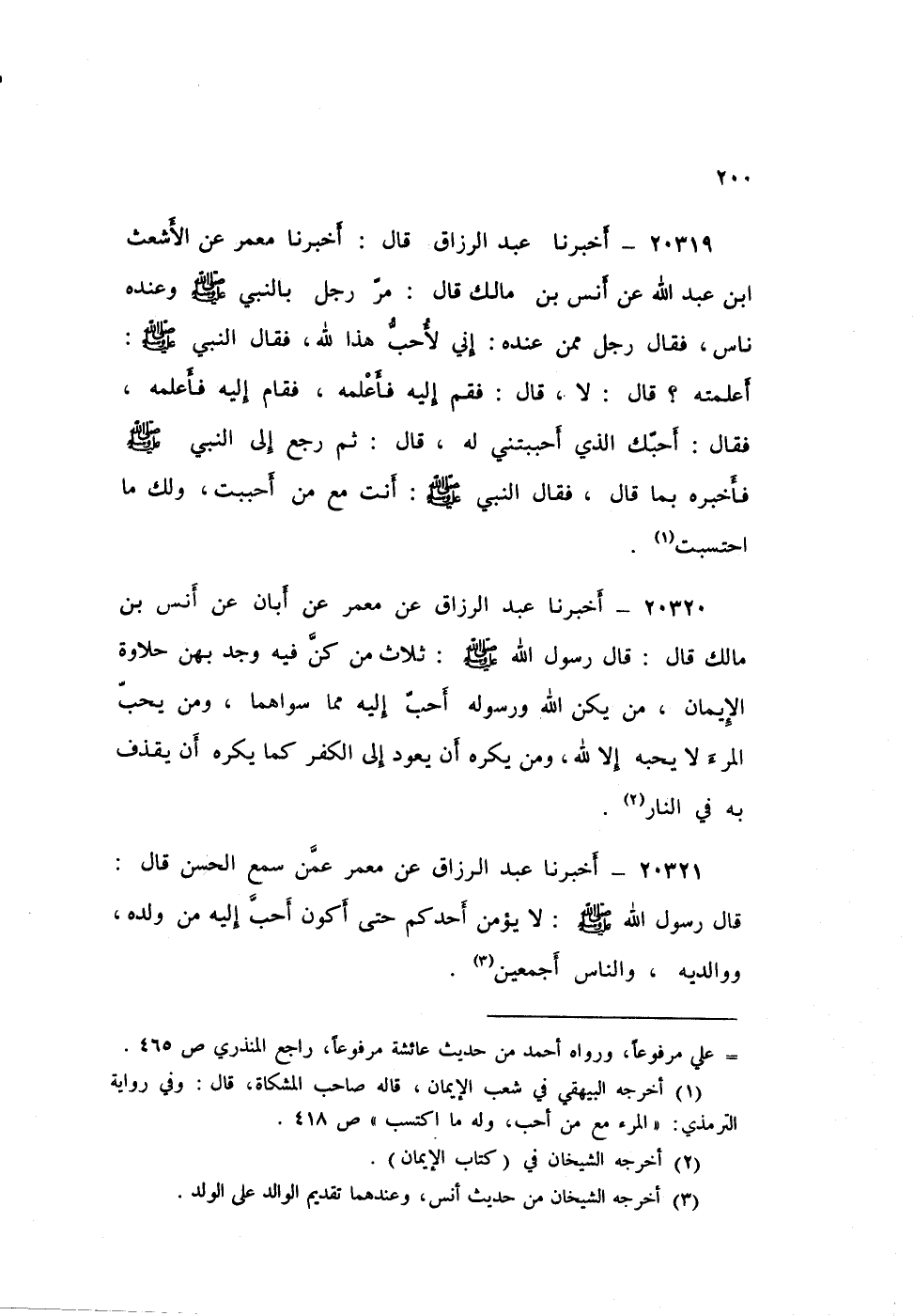 ٢٠٣٢٠ - أَخْبَرَنَا عَبْدُ الرَّزَّاقِ عَنْ مَعْمَرٍ، عَنْ أَبَانَ، عَنْ أَنَسِ بْنِ مَالِكٍ، قَالَ: قَالَ رَسُولُ اللَّهِ صَلَّى اللهُ عَلَيْهِ وَسَلَّمَ: «ثَلَاثٌ مَنْ كُنَّ فِيهِ وَجَدَ بِهِنَّ حَلَاوَةَ الْإِيمَانِ: مَنْ يَكُنِ اللَّهُ وَرَسُولُهُ أَحَبَّ إِلَيْهِ مِمَّا سِوَاهُمَا، وَمَنْ يُحِبُّ الْمَرْءَ لَا يُحِبُّهُ إِلَّا لِلَّهِ، وَمَنْ يَكْرَهُ أَنْ يَعُودَ إِلَى الْكُفْرِ كَمَا يَكْرَهُ أَنْ يُقْذَفَ بِهِ فِي النَّارِ»