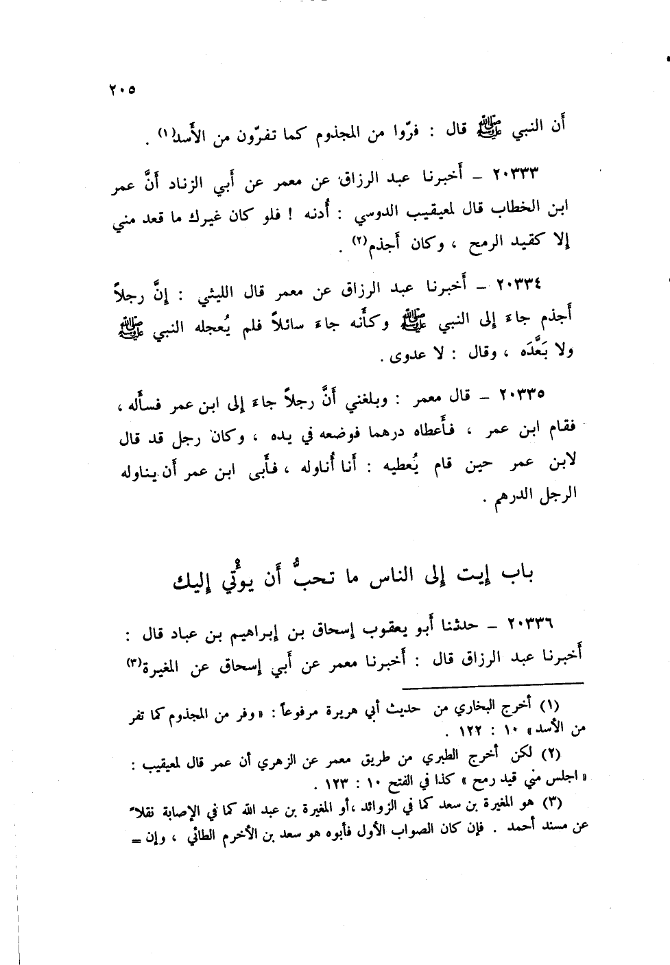 ٢٠٣٣٥ - قَالَ مَعْمَرٌ: وَبَلَغَنِي أَنَّ رَجُلًا جَاءَ إِلَى ابْنِ عُمَرَ فَسَأَلَهُ، «فَقَامَ ابْنُ عُمَرَ فَأَعْطَاهُ دِرْهَمًا، فَوَضَعَهُ فِي يَدِهِ، وَكَانَ رَجُلٌ قَدْ قَالَ لِابْنِ عُمَرَ حِينَ قَامَ يُعْطِيهِ: أَنَا أُنَاوِلُهُ، فَأَبَى ابْنُ عُمَرَ أَنْ يُنَاوِلَهُ الرَّجُلُ الدِّرْهَمَ»