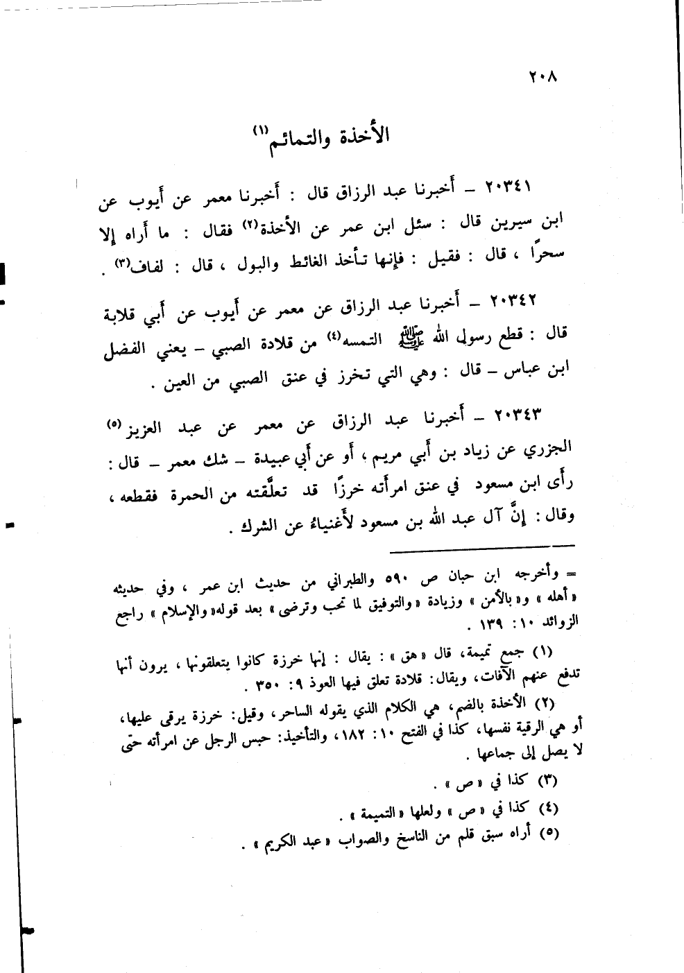 ٢٠٣٤٢ - أَخْبَرَنَا عَبْدُ الرَّزَّاقِ عَنْ مَعْمَرٍ، عَنْ أَيُّوبَ، عَنْ أَبِي قِلَابَةَ، قَالَ: «قَطَعَ رَسُولُ اللَّهِ صَلَّى اللهُ عَلَيْهِ وَسَلَّمَ التَّمِيمَةَ مِنْ قِلَادَةِ الصَّبِيِّ» يَعْنِي الْفَضْلَ بْنَ عَبَّاسٍ، قَالَ: وَهِيَ الَّتِي تُخْرَزُ فِي عُنُقِ الصَّبِيِّ مِنَ الْعَيْنِ