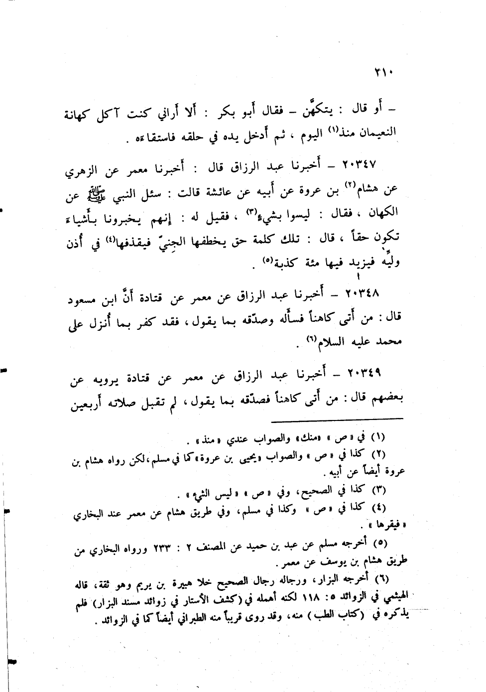 ٢٠٣٤٨ - أَخْبَرَنَا عَبْدُ الرَّزَّاقِ عَنْ مَعْمَرٍ، عَنْ قَتَادَةَ أَنَّ ابْنَ مَسْعُودٍ، قَالَ: «مَنْ أَتَى كَاهِنًا فَسَأَلَهُ وَصَدَّقَهُ بِمَا يَقُولُ، فَقَدْ كَفَرَ بِمَا أُنْزِلَ عَلَى مُحَمَّدٍ عَلَيْهِ السَّلَامُ»