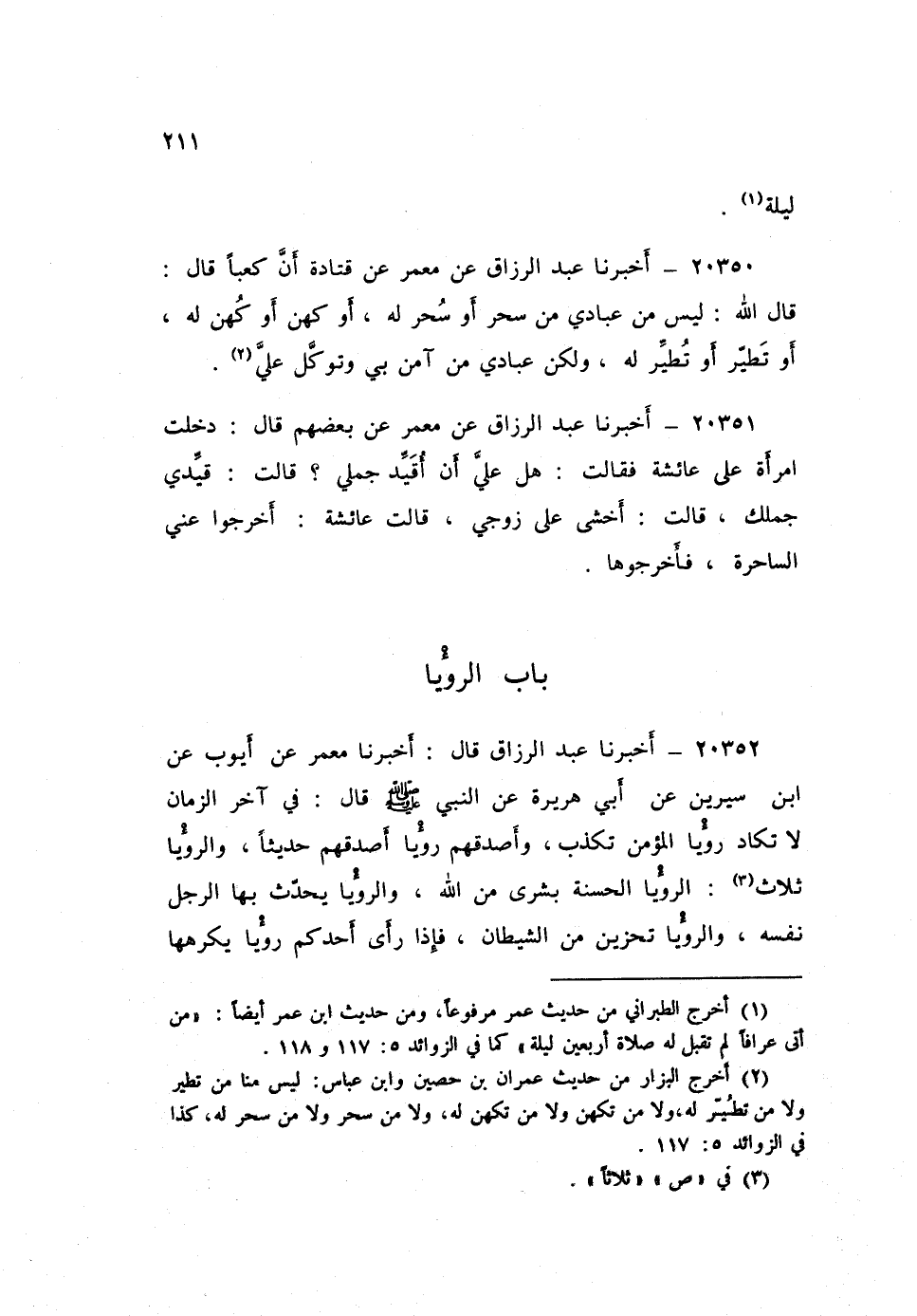 ٢٠٣٥٢ - أَخْبَرَنَا عَبْدُ الرَّزَّاقِ قَالَ: أَخْبَرَنَا مَعْمَرٌ، عَنْ أَيُّوبَ، عَنِ ابْنِ سِيرِينَ، عَنْ أَبِي هُرَيْرَةَ، عَنِ النَّبِيِّ صَلَّى اللهُ عَلَيْهِ وَسَلَّمَ قَالَ: «فِي آخِرِ الزَّمَانِ لَا تَكَادُ رُؤْيَا الْمُؤْمِنِ تَكْذِبُ، وَأَصْدَقُهُمْ رُؤْيَا أَصْدَقُهُمْ حَدِيثًا، وَالرُّؤْيَا ثَلَاثٌ: الرُّؤْيَا الْحَسَنَةُ بُشْرَى مِنَ اللَّهِ، وَالرُّؤْيَا يُحَدِّثُ بِهَا الرَّجُلُ نَفْسَهُ، وَالرُّؤْيَا تَحْزِينٌ مِنَ الشَّيْطَانِ، فَإِذَا رَأَى أَحَدُكُمْ رُؤْيَا يَكْرَهُهَا فَلَا يُحَدِّثْ بِهَا أَحَدًا وَلْيَقُمْ فَلْيُصَلِّ» ، قَالَ أَبُو هُرَيْرَةَ: «يُعْجِبُنِي الْقَيْدُ وَأَكْرَهُ الْغُلَّ، الْقَيْدُ ثَبَاتٌ فِي الدِّينِ»
