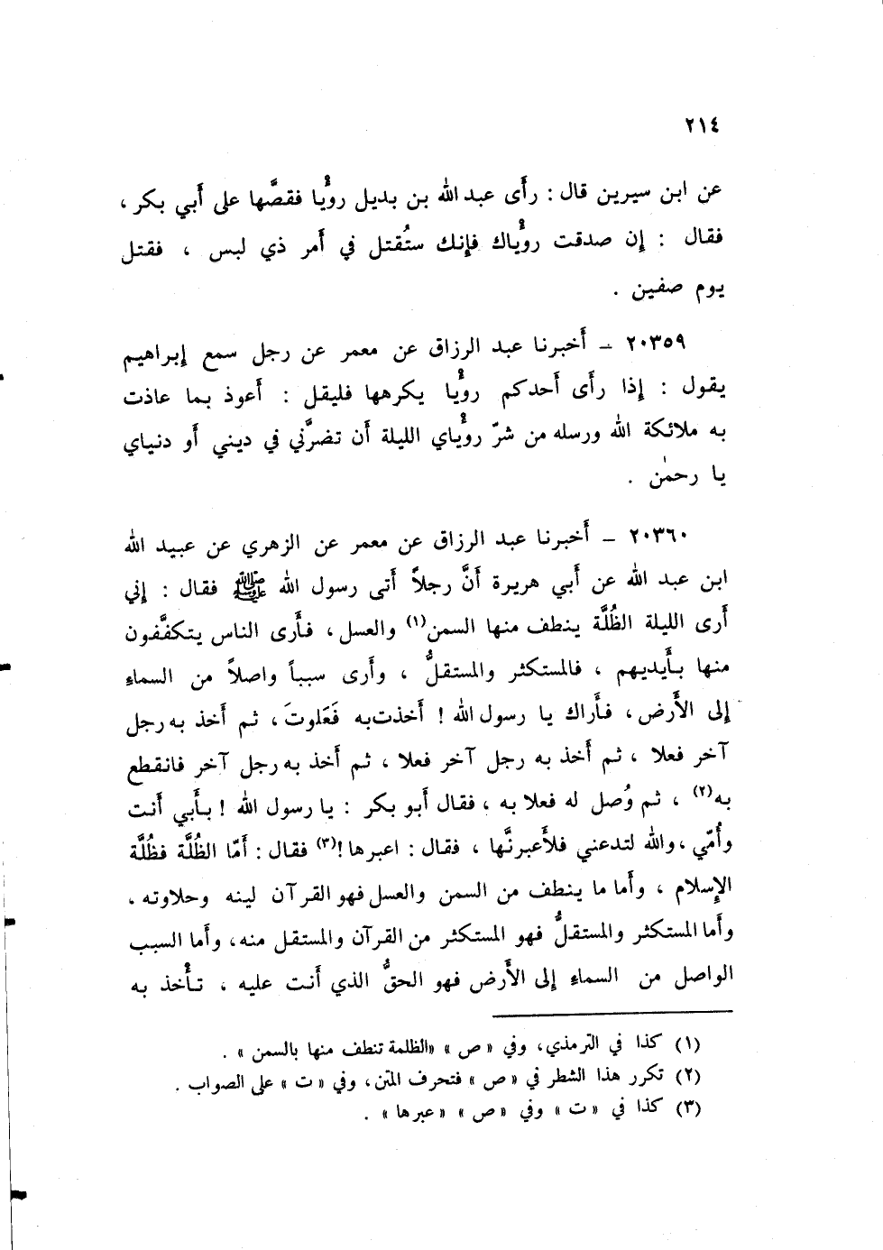 ٢٠٣٦٠ - أَخْبَرَنَا عَبْدُ الرَّزَّاقِ عَنْ مَعْمَرٍ، عَنِ الزُّهْرِيِّ، عَنْ عُبَيْدِ اللَّهِ بْنِ عَبْدِ اللَّهِ، عَنْ أَبِي هُرَيْرَةَ، أَنَّ رَجُلًا أَتَى رَسُولَ اللَّهِ صَلَّى اللهُ عَلَيْهِ وَسَلَّمَ فَقَالَ: إِنِّي أَرَى اللَّيْلَةَ الظُّلَّةَ يُنْطَفُ مِنْهَا السَّمْنُ وَالْعَسَلُ، فَأَرَى النَّاسَ يَتَكَفَّفُونَ مِنْهَا بِأَيْدِيهِمْ، فَالْمُسْتَكْثِرُ وَالْمُسْتَقِلُّ، وَأَرَى سَبَبًا وَاصِلًا مِنَ السَّمَاءِ إِلَى الْأَرْضِ، فَأَرَاكَ يَا رَسُولَ اللَّهِ أَخَذْتَ بِهِ فَعَلَوْتَ، ثُمَّ أَخَذَ بِهِ رَجُلٌ آخَرُ فَعَلَا، ثُمَّ أَخَذَ بِهِ رَجُلٌ آخَرُ فَعَلَا، ثُمَّ أَخَذَ بِهِ رَجُلٌ آخَرُ فَانْقَطَعَ بِهِ، ثُمَّ وُصِلَ لَهُ فَعَلَا بِهِ، فَقَالَ أَبُو بَكْرٍ: يَا رَسُولَ اللَّهِ، بِأَبِي أَنْتَ وَأُمِّي، وَاللَّهِ لَتَدَعَنِّي فَلَأَعْبُرَنَّهَا، فَقَالَ: «اعْبُرْهَا» فَقَالَ: أَمَّا الظُّلَّةُ فَظُلَّةُ الْإِسْلَامُ، وَأَمَّا مَا يُنْطَفُ مِنَ السَّمْنِ وَالْعَسَلِ فَهُوَ الْقُرْآنُ لِينُهُ وَحَلَاوَتُهُ، وَأَمَّا الْمُسْتَكْثِرُ وَالْمُسْتَقِلُّ فَهُوَ الْمُسْتَكْثِرُ مِنَ الْقُرْآنِ، وَالْمُسْتَقِلُّ مِنْهُ، وَأَمَّا السَّبَبُ الْوَاصِلُ مِنَ السَّمَاءِ إِلَى الْأَرْضِ فَهُوَ الْحَقُّ الَّذِي أَنْتَ عَلَيْهِ، تَأْخُذُ بِهِ ⦗٢١٥⦘ فَيُعْلِيكَ اللَّهُ، ثُمَّ يَأْخُذُ بِهِ رَجُلٌ آخَرُ بَعْدَكَ فَيَعْلُو بِهِ، ثُمَّ يَأْخُذُ بِهِ رَجُلٌ آخَرُ بَعْدَهُ فَيَعْلُو بِهِ، ثُمَّ يَأْخُذُ بِهِ رَجُلٌ آخَرُ فَيَنْقَطِعُ بِهِ، ثُمَّ يُوصَلُ لَهُ فَيَعْلُو بِهِ، أَيْ رَسُولَ اللَّهِ، لَتُحَدِّثْنِي أَصَبْتُ أَمْ أَخْطَأْتُ؟ قَالَ: «أَصَبْتَ بَعْضًا، وَأَخْطَأْتَ بَعْضًا» قَالَ: أَقْسَمْتُ يَا رَسُولَ اللَّهِ، لَتُخْبِرَنِّي بِالَّذِي أَخْطَأْتُ قَالَ: «لَا تُقْسِمْ»