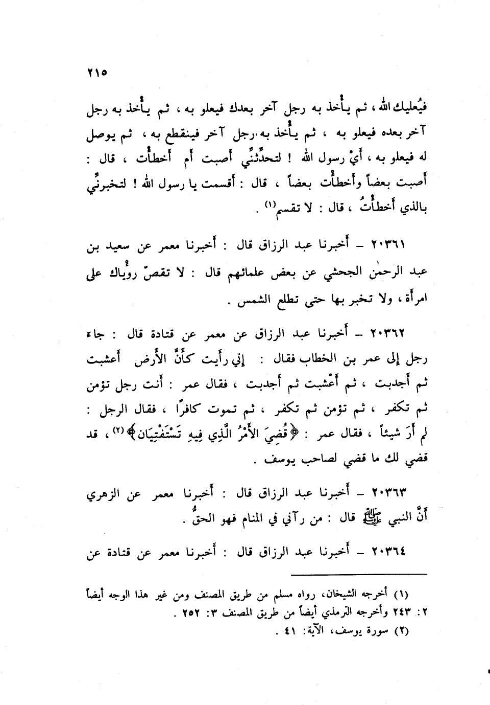 ٢٠٣٦٢ - أَخْبَرَنَا عَبْدُ الرَّزَّاقِ عَنْ مَعْمَرٍ، عَنْ قَتَادَةَ، قَالَ: جَاءَ رَجُلٌ إِلَى عُمَرَ بْنِ الْخَطَّابِ فَقَالَ: إِنِّي رَأَيْتُ كَأَنَّ الْأَرْضَ أعْشَبَتْ، ثُمَّ أجْدَبَتْ، ثُمَّ أعْشَبَتْ، ثُمَّ أجْدَبَتْ، فَقَالَ عُمَرُ: «أَنْتَ رَجُلٌ تُؤْمِنُ ثُمَّ تَكْفُرُ، ثُمَّ تُؤْمِنُ ثُمَّ تَكْفُرُ، ثُمَّ تَمُوتُ كَافِرًا» ، فَقَالَ الرَّجُلُ: لَمْ أَرَ شَيْئًا، فَقَالَ عُمَرُ: {قُضِيَ الْأَمْرُ الَّذِي فِيهِ تَسْتَفْتِيَانِ} [يوسف: ٤١] ، «قَدْ قُضِيَ لَكَ مَا قُضِيَ لِصَاحِبِ يُوسُفَ»