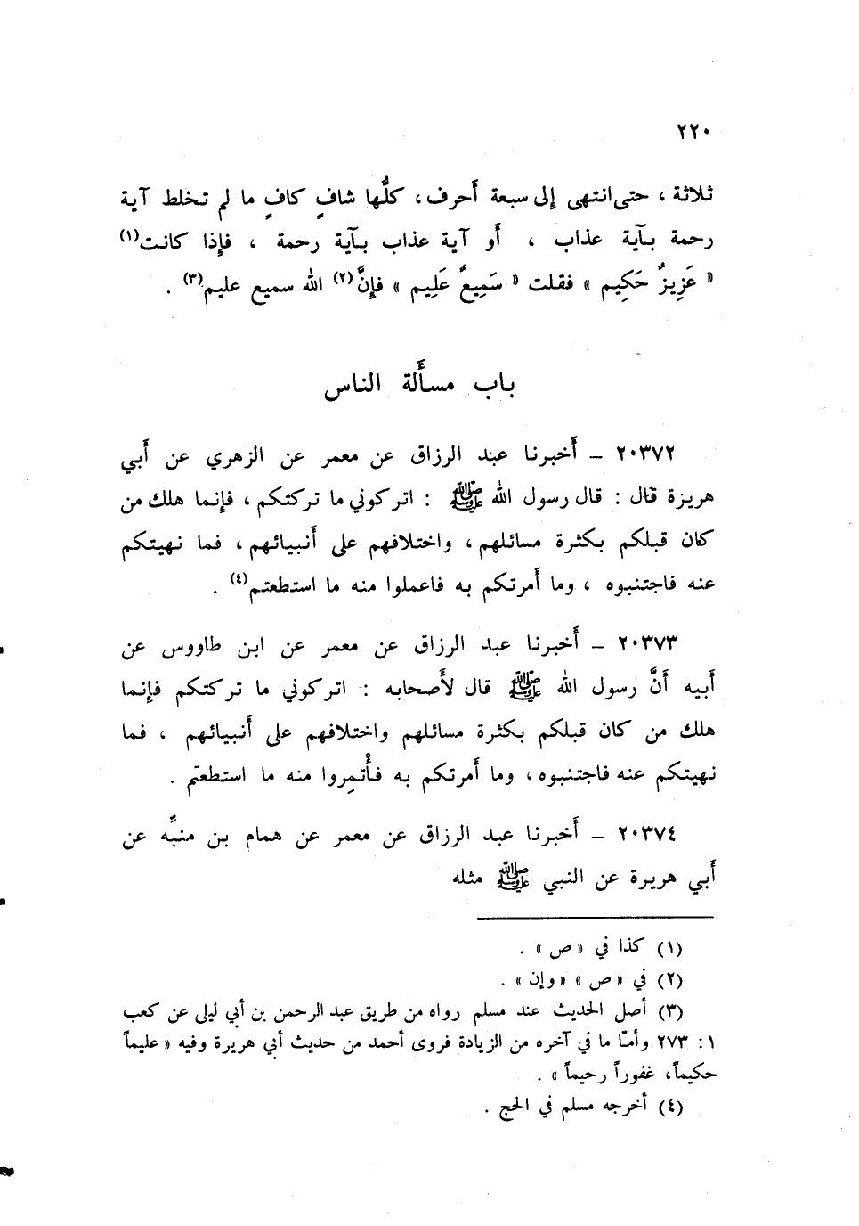 ٢٠٣٧٣ - أَخْبَرَنَا عَبْدُ الرَّزَّاقِ، عَنْ مَعْمَرٍ، عَنِ ابْنِ طَاوُسٍ، عَنْ أَبِيهِ، أَنَّ رَسُولَ اللَّهِ صَلَّى اللهُ عَلَيْهِ وَسَلَّمَ قَالَ لِأَصْحَابِهِ: «اتْرُكُونِي مَا تَرَكْتُكُمْ، فَإِنَّمَا هَلَكَ مَنْ كَانَ قَبْلَكُمْ بِكَثْرَةِ مَسَائِلِهِمْ وَاخْتِلَافِهِمْ عَلَى أَنْبِيَائِهِمْ، فَمَا نَهَيْتُكُمْ عَنْهُ فَاجْتَنِبُوهُ، وَمَا أَمَرْتُكُمْ بِهِ فَأْتَمِرُوا مِنْهُ مَا اسْتَطَعْتُمْ» ،