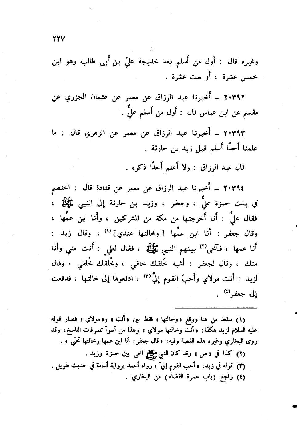 ٢٠٣٩٣ - أَخْبَرَنَا عَبْدُ الرَّزَّاقِ، عَنْ مَعْمَرٍ، عَنِ الزُّهْرِيِّ قَالَ: «مَا عَلِمْنَا أَحَدًا أَسْلَمَ قَبْلَ زَيْدِ بْنِ حَارِثَةَ» قَالَ عَبْدُ الرَّزَّاقِ: «وَلَا أَعْلَمُ أَحَدًا ذَكَرَهُ»