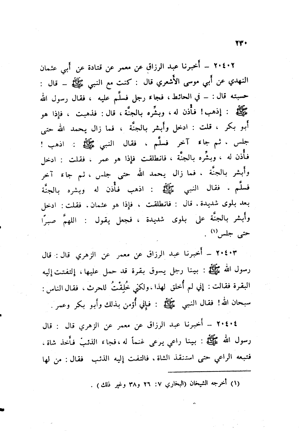 ٢٠٤٠٣ - أَخْبَرَنَا عَبْدُ الرَّزَّاقِ، عَنْ مَعْمَرٍ، عَنِ الزُّهْرِيِّ، قَالَ: قَالَ رَسُولُ اللَّهِ صَلَّى اللهُ عَلَيْهِ وَسَلَّمَ: «بَيْنَا رَجُلٌ يَسُوقُ بَقَرَةً قَدْ حَمَلَ عَلَيْهَا، الْتَفَتَتْ إِلَيْهِ الْبَقَرَةُ فَقَالَتْ: إِنِّي لَمْ أُخْلَقْ لِهَذَا، وَلَكِنِّي خُلِقْتُ لِلْحَرْثِ» ، فَقَالَ النَّاسُ: سُبْحَانَ اللَّهِ، فَقَالَ النَّبِيُّ صَلَّى اللهُ عَلَيْهِ وَسَلَّمَ: «فَإِنِّي أُؤْمِنُ بِذَلِكَ، وَأَبُو بَكْرٍ، وَعُمَرُ»