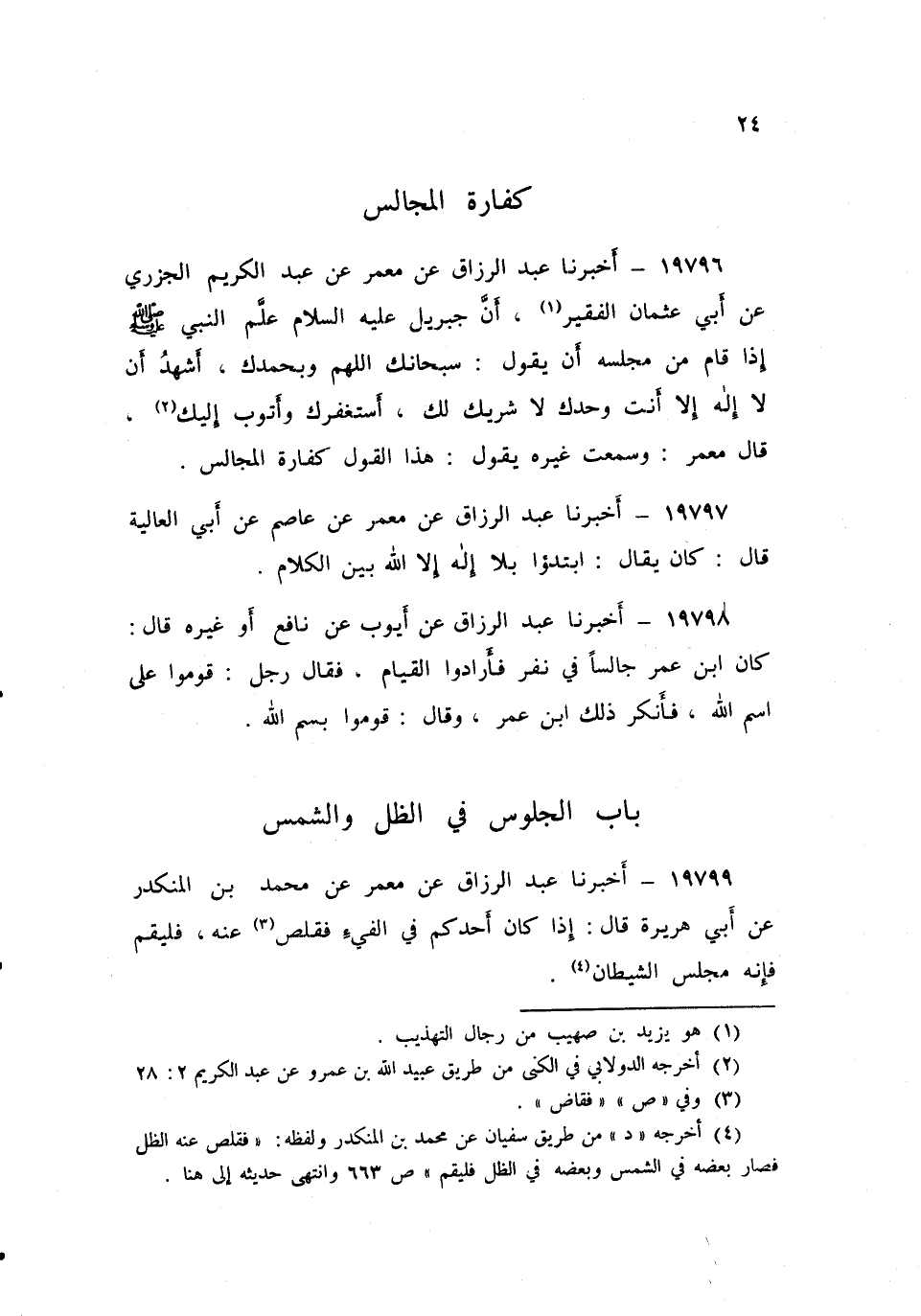 ١٩٧٩٦ - أَخْبَرَنَا عَبْدُ الرَّزَّاقِ، عَنْ مَعْمَرٍ، عَنْ عَبْدِ الْكَرِيمِ الْجَزَرِيِّ، عَنْ أَبِي عُثْمَانَ الْفَقِيرِ، أَنَّ جِبْرِيلَ، عَلَيْهِ السَّلَامُ عَلَّمَ النَّبِيَّ صَلَّى اللهُ عَلَيْهِ وَسَلَّمَ إِذَا قَامَ مِنْ مَجْلِسِهِ أَنْ يَقُولَ: «سُبْحَانَكَ اللَّهُمَّ وَبِحَمْدِكَ، أَشْهَدُ أَنْ لَا إِلَهَ إِلَّا أَنْتَ، وَحْدَكَ لَا شَرِيكَ لَكَ، أَسْتَغْفِرُكَ وَأَتُوبُ إِلَيْكَ» قَالَ مَعْمَرٌ: «وَسَمِعْتُ غَيْرَهُ يَقُولُ: هَذَا الْقَوْلُ كَفَّارَةُ الْمَجْلِسِ»