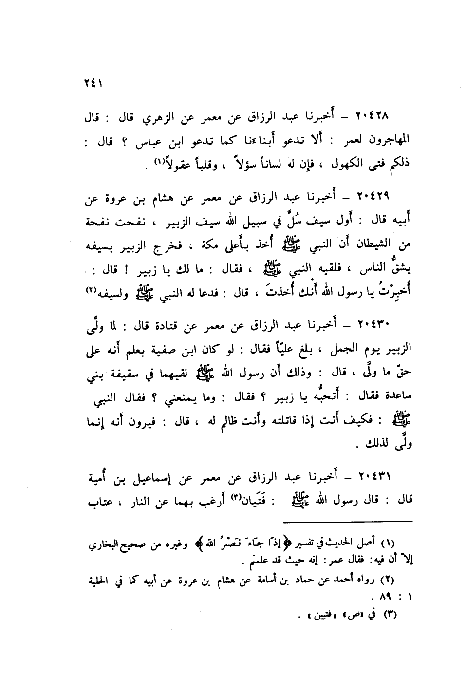 ٢٠٤٢٩ - أَخْبَرَنَا عَبْدُ الرَّزَّاقِ، عَنْ مَعْمَرٍ، عَنْ هِشَامِ بْنِ عُرْوَةَ، عَنْ أَبِيهِ، قَالَ: أَوَّلُ سَيْفٍ سُلَّ فِي سَبِيلِ اللَّهِ سَيْفُ الزُّبَيْرِ، نُفِحَتْ نَفْحَةٌ مِنَ الشَّيْطَانِ أَنَّ النَّبِيَّ صَلَّى اللهُ عَلَيْهِ وَسَلَّمَ أُخِذَ بِأَعْلَى مَكَّةَ، فَخَرَجَ الزُّبَيْرُ بسيفه يَشُقُّ النَّاسَ، فَلَقِيَهُ النَّبِيُّ صَلَّى اللهُ عَلَيْهِ وَسَلَّمَ فَقَالَ: «مَا لَكَ يَا زُبَيْرُ؟» ، قَالَ: أُخْبِرْتُ يَا رَسُولَ اللَّهِ أَنَّكَ أُخِذْتَ، قَالَ: فَدَعَا لَهُ النَّبِيُّ صَلَّى اللهُ عَلَيْهِ وَسَلَّمَ وَلِسَيفِهِ