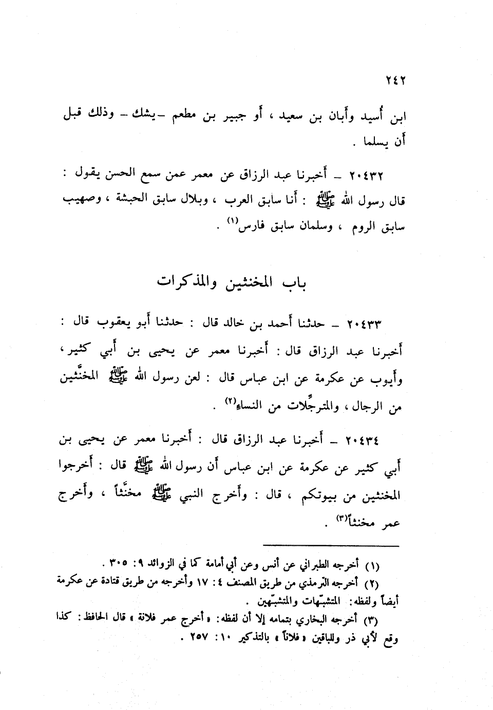 ٢٠٤٣٣ - حَدَّثَنَا أَحْمَدُ بْنُ خَالِدٍ قَالَ: حَدَّثَنَا أَبُو يَعْقُوبَ قَالَ: أَخْبَرَنَا عَبْدِ الرَّزَّاقِ قَالَ: أَخْبَرَنَا مَعْمَرٌ، عَنْ يَحْيَى بْنِ أَبِي كَثِيرٍ، وَأَيُّوبَ، عَنْ عِكْرِمَةَ، عَنِ ابْنِ عَبَّاسٍ، قَالَ: «لَعَنَ رَسُولُ اللَّهِ صَلَّى اللهُ عَلَيْهِ وَسَلَّمَ الْمُخَنَّثِينَ مِنَ الرِّجَالِ، وَالْمُتَرَجِّلَاتِ مِنَ النِّسَاءِ»