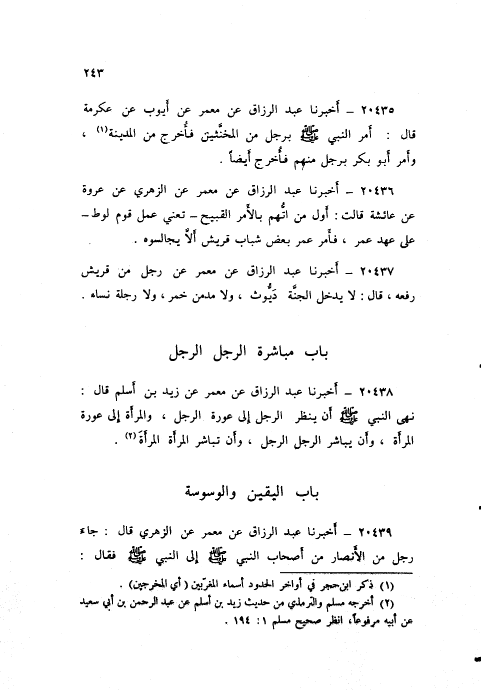 ٢٠٤٣٨ - أَخْبَرَنَا عَبْدُ الرَّزَّاقِ، عَنْ مَعْمَرٍ، عَنْ زَيْدِ بْنِ أَسْلَمَ، قَالَ: «نَهَى النَّبِيُّ صَلَّى اللهُ عَلَيْهِ وَسَلَّمَ أَنْ يَنْظُرَ الرَّجُلُ إِلَى عَوْرَةِ الرَّجُلِ، وَالْمَرْأَةُ إِلَى عَوْرَةِ الْمَرْأَةِ، وَأَنْ يُبَاشِرَ الرَّجُلُ الرَّجُلَ، وَأَنْ تُبَاشِرَ الْمَرْأَةُ الْمَرْأَةَ»