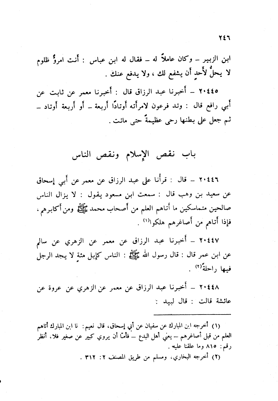 ٢٠٤٤٦ - قَالَ قَرَأْنَا عَلَى عَبْدِ الرَّزَّاقِ، عَنْ مَعْمَرٍ، عَنْ أَبِي إِسْحَاقَ، عَنْ سَعِيدِ بْنِ وَهْبٍ، قَالَ: سَمِعْتُ ابْنَ مَسْعُودٍ يَقُولُ: «لَا يَزَالُ النَّاسُ صَالِحِينَ مُتَمَاسِكِينَ مَا أَتَاهُمُ الْعِلْمُ مِنْ أَصْحَابِ مُحَمَّدٍ صَلَّى اللهُ عَلَيْهِ وَسَلَّمَ، وَمِنْ أَكَابِرِهِمْ، فَإِذَا أَتَاهُمْ مِنْ أَصَاغِرِهِمْ هَلَكُوا»