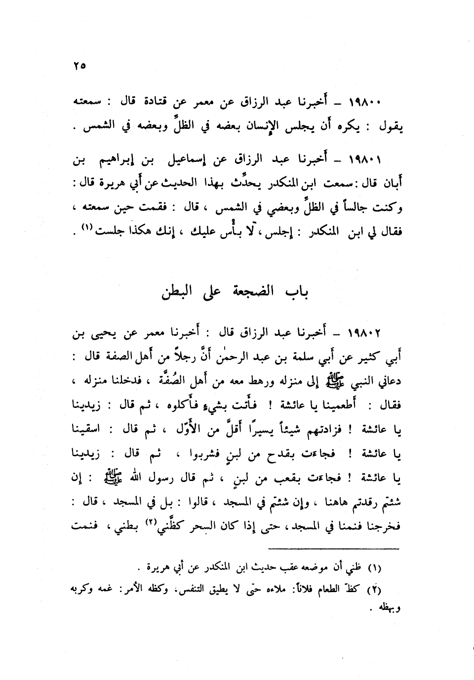 ١٩٨٠١ - أَخْبَرَنَا عَبْدُ الرَّزَّاقِ، عَنْ مَعْمَرٍ، عَنْ إِسْمَاعِيلَ بْنِ إِبْرَاهِيمَ بْنِ أَبَانَ، قَالَ: سَمِعْتُ ابْنَ الْمُنْكَدِرِ يُحَدِّثُ بِهَذَا الْحَدِيثِ: عَنْ أَبِي هُرَيْرَةَ، قَالَ: وَكُنْتُ جَالِسًا فِي الظِّلِّ وَبَعْضِي فِي الشَّمْسِ، قَالَ: فَقُمْتُ حِينَ سَمِعْتُهُ فَقَالَ لِي ابْنُ الْمُنْكَدِرِ: «اجْلِسْ لَا بَأْسَ عَلَيْكَ، إِنَّكَ هَكَذَا جَلَسْتَ»