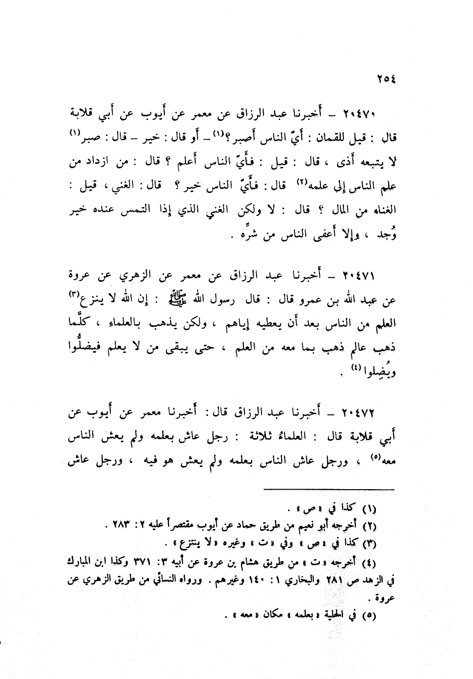 ٢٠٤٧٢ - أَخْبَرَنَا عَبْدُ الرَّزَّاقِ، قَالَ أَخْبَرَنَا مَعْمَرٌ، عَنْ أَيُّوبَ، عَنْ أَبِي قِلَابَةَ، قَالَ: «الْعُلَمَاءُ ثَلَاثَةٌ: رَجُلٌ عَاشَ بِعِلْمِهِ وَلَمْ يَعِشِ النَّاسُ مَعَهُ، وَرَجُلٌ عَاشَ النَّاسُ بِعِلْمِهِ وَلَمْ يَعِشْ هُوَ فِيهِ، وَرَجُلٌ عَاشَ بِعِلْمِهِ وَعَاشَ النَّاسُ بِعِلْمِهِ»