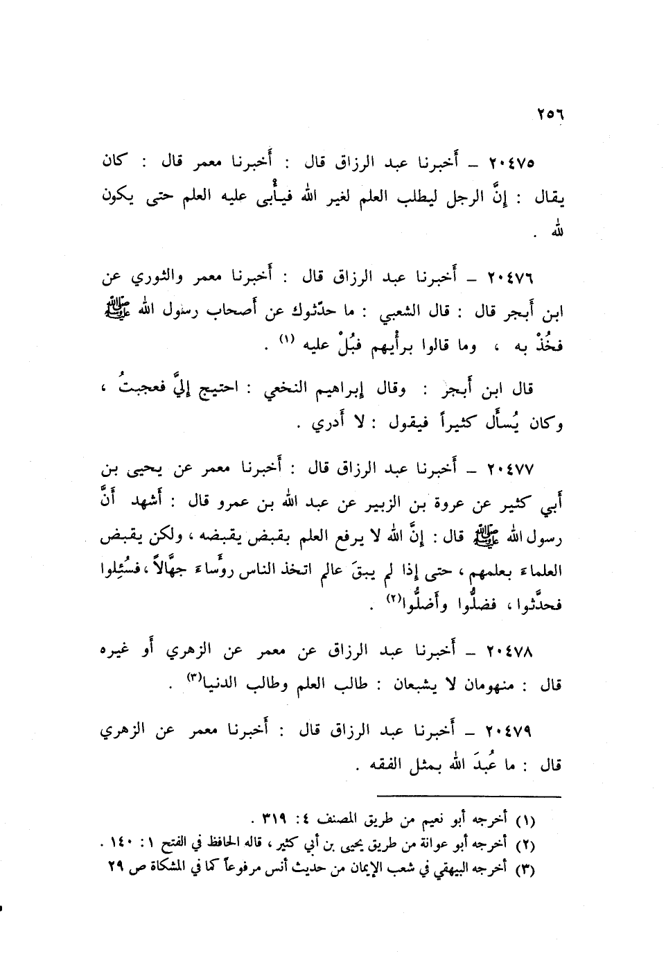 ٢٠٤٧٧ - أَخْبَرَنَا عَبْدُ الرَّزَّاقِ، قَالَ أَخْبَرَنَا مَعْمَرٌ، عَنْ يَحْيَى بْنِ أَبِي كَثِيرٍ، عَنْ عُرْوَةَ بْنِ الزُّبَيْرِ، عَنْ عَبْدِ اللَّهِ بْنِ عَمْرٍو، قَالَ: أَشْهَدُ أَنَّ رَسُولَ اللَّهِ صَلَّى اللهُ عَلَيْهِ وَسَلَّمَ قَالَ: «إِنَّ اللَّهَ لَا يَرْفَعُ الْعِلْمَ بِقَبْضٍ يَقْبِضُهُ، وَلَكِنْ يَقْبِضُ الْعُلَمَاءَ بِعِلْمِهِمْ، حَتَّى إِذَا لَمْ يَبْقَ عَالِمٌ اتَّخَذَ النَّاسُ رُؤَسَاءَ جُهَّالًا، فَسُئِلُوا فَحَدَّثُوا، فَضَلُّوا وَأَضَلُّوا»