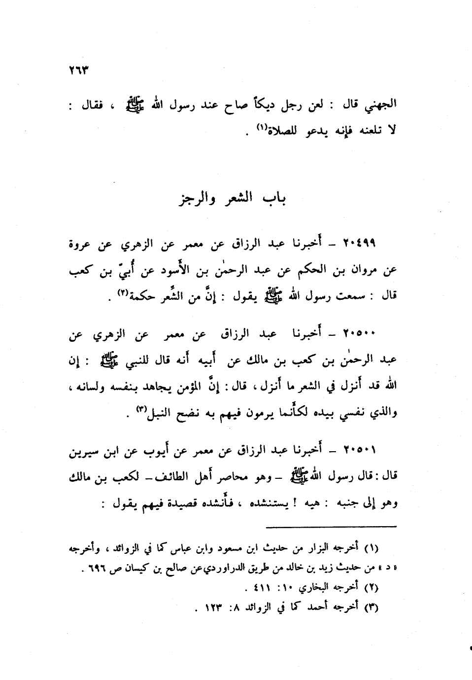 ٢٠٥٠٠ - أَخْبَرَنَا عَبْدُ الرَّزَّاقِ، قَالَ أَخْبَرَنَا مَعْمَرٌ، عَنِ الزُّهْرِيِّ، عَنْ عَبْدِ الرَّحْمَنِ بْنِ كَعْبِ بْنِ مَالِكٍ، عَنْ أَبِيهِ، أَنَّهُ قَالَ لِلنَّبِيِّ صَلَّى اللهُ عَلَيْهِ وَسَلَّمَ: إِنَّ اللَّهَ قَدْ أَنْزَلَ فِي الشِّعْرِ مَا أَنْزَلَ، قَالَ: «إِنَّ الْمُؤْمِنَ يُجَاهِدُ بِنَفْسِهِ وَلِسَانِهِ، وَالَّذِي نَفْسِي بِيَدِهِ لَكَأَنَّمَا يَرْمُونَ فِيهِمْ بِهِ نَضْحَ النَّبْلِ»