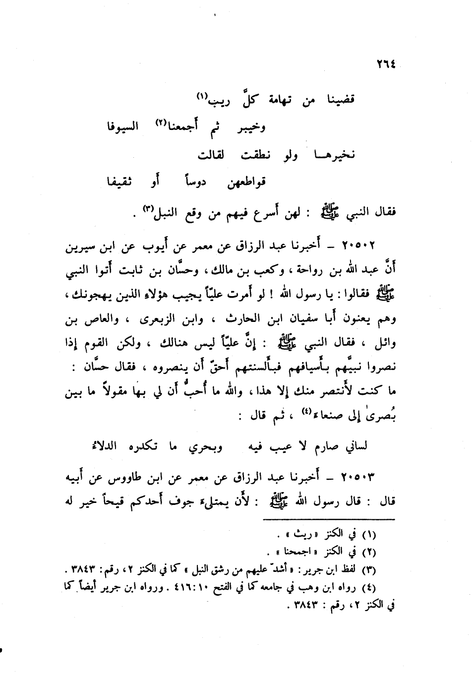 ٢٠٥٠٢ - أَخْبَرَنَا عَبْدُ الرَّزَّاقِ، عَنْ مَعْمَرٍ، عَنْ أَيُّوبَ، عَنِ ابْنِ سِيرِينَ، أَنَّ عَبْدَ اللَّهِ بْنَ رَوَاحَةَ، وَكَعْبَ بْنَ مَالِكٍ، وَحَسَّانَ بْنَ ثَابِتٍ، أَتَوُا النَّبِيَّ صَلَّى اللهُ عَلَيْهِ وَسَلَّمَ فَقَالُوا: يَا رَسُولَ اللَّهِ، لَوْ أَمَرْتَ عَلِيًّا يُجِيبُ هَؤُلَاءِ الَّذِينَ يَهْجُونَكَ وَهُمْ يَعْنُونَ أَبَا سُفْيَانَ بْنَ الْحَارِثِ، وَابْنَ الزِّبَعْرَى، وَالْعَاصَ بْنَ وَائِلٍ فَقَالَ النَّبِيُّ صَلَّى اللهُ عَلَيْهِ وَسَلَّمَ: «إِنَّ عَلِيًّا لَيْسَ هُنَالِكَ، وَلَكِنَّ الْقَوْمَ إِذَا نَصَرُوا نَبِيَّهُمْ بِأَسْيَافِهِمْ فَبِأَلْسنَتِهِمْ أَحَقُّ أَنْ يَنصْرُوهُ» ، فَقَالَ حَسَّانُ: مَا كُنْتُ لِأَنْتصِرَ مِنْكَ إِلَّا هَذَا، وَاللَّهِ مَا أُحِبُّ أَنَّ لِي بِهَا مَقُولًا مَا بَيْنَ بُصْرَى إِلَى صَنْعَاءَ، ثُمَّ قَالَ: