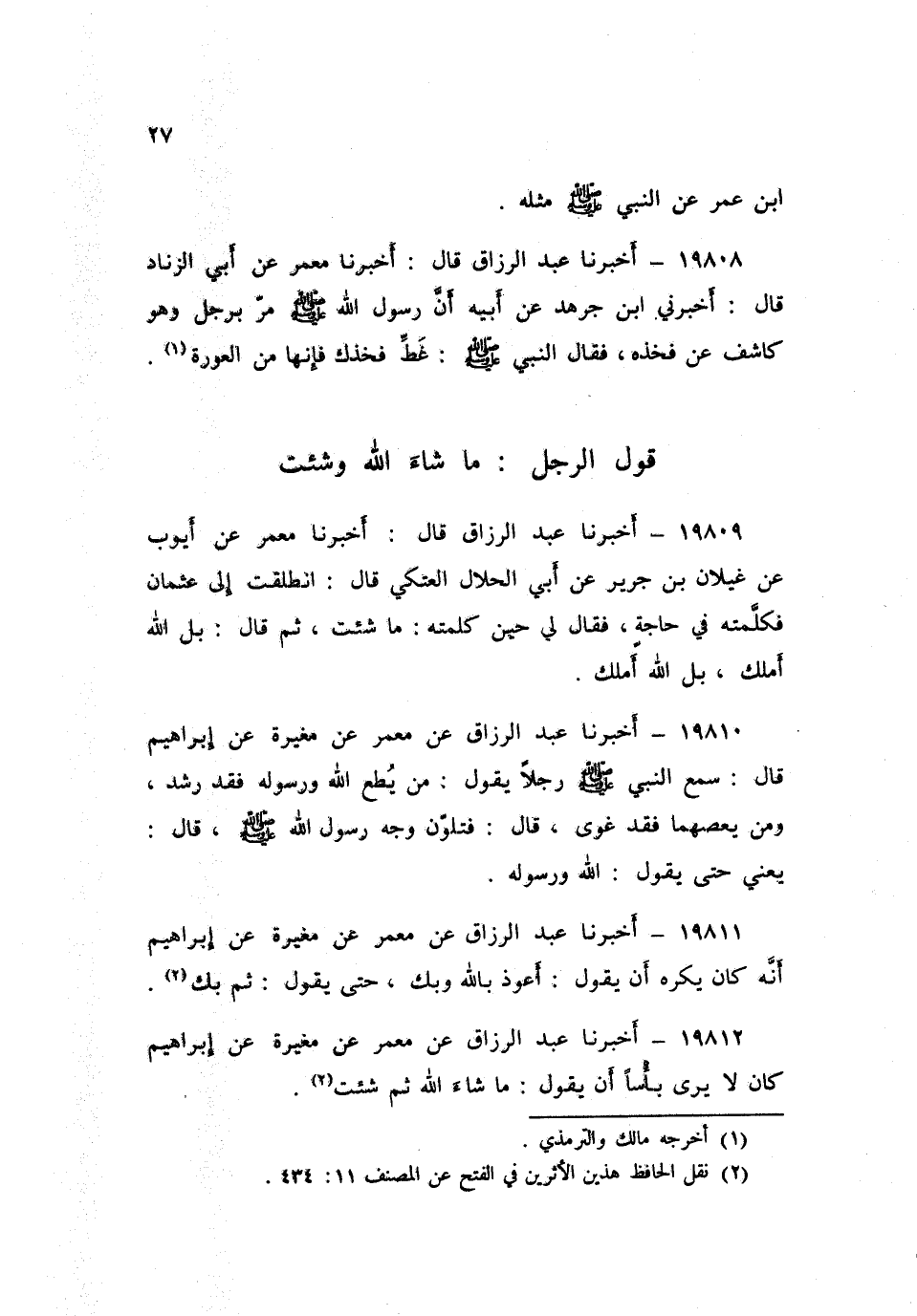 ١٩٨١٢ - أَخْبَرَنَا عَبْدُ الرَّزَّاقِ، عَنْ مَعْمَرٍ، عَنْ مُغِيرَةَ، عَنْ إِبْرَاهِيمَ، كَانَ لَا يَرَى بَأْسًا أَنْ يَقُولَ: «مَا شَاءَ اللَّهُ ثُمَّ شِئْتَ»
