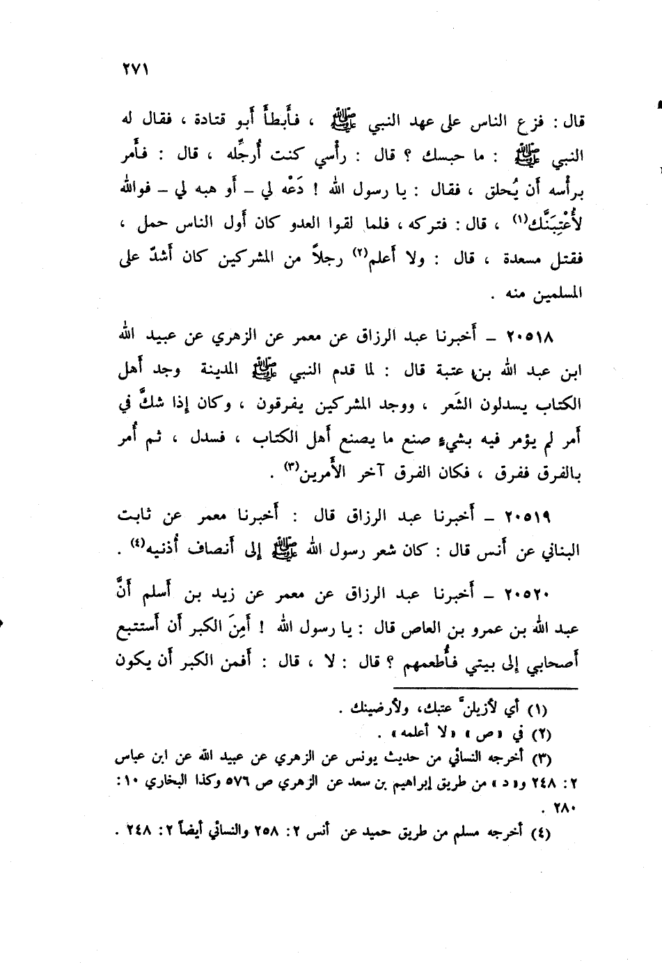 ٢٠٥١٨ - أَخْبَرَنَا عَبْدُ الرَّزَّاقِ، عَنْ مَعْمَرٍ، عَنِ الزُّهْرِيِّ، عَنْ عُبَيْدِ اللَّهِ بْنِ عَبْدِ اللَّهِ بْنِ عُتْبَةَ، قَالَ: لَمَّا قَدِمَ النَّبِيُّ صَلَّى اللهُ عَلَيْهِ وَسَلَّمَ الْمَدِينَةَ وَجَدَ أَهْلَ الْكِتَابِ يَسْدِلُونَ الشَّعْرَ، وَوَجَدَ الْمُشْرِكِينَ يَفْرُقُونَ، «وَكَانَ إِذَا شَكَّ فِي أَمْرٍ لَمْ يُؤْمَرْ فِيهِ بِشَيْءٍ صَنَعَ مَا يَصْنَعُ أَهْلُ الْكِتَابِ، فَسَدَلَ، ثُمَّ أَمَرَ بِالْفَرْقِ، فَفَرَقَ فَكَانَ الْفَرْقُ آخِرَ الْأَمْرَيْنِ»