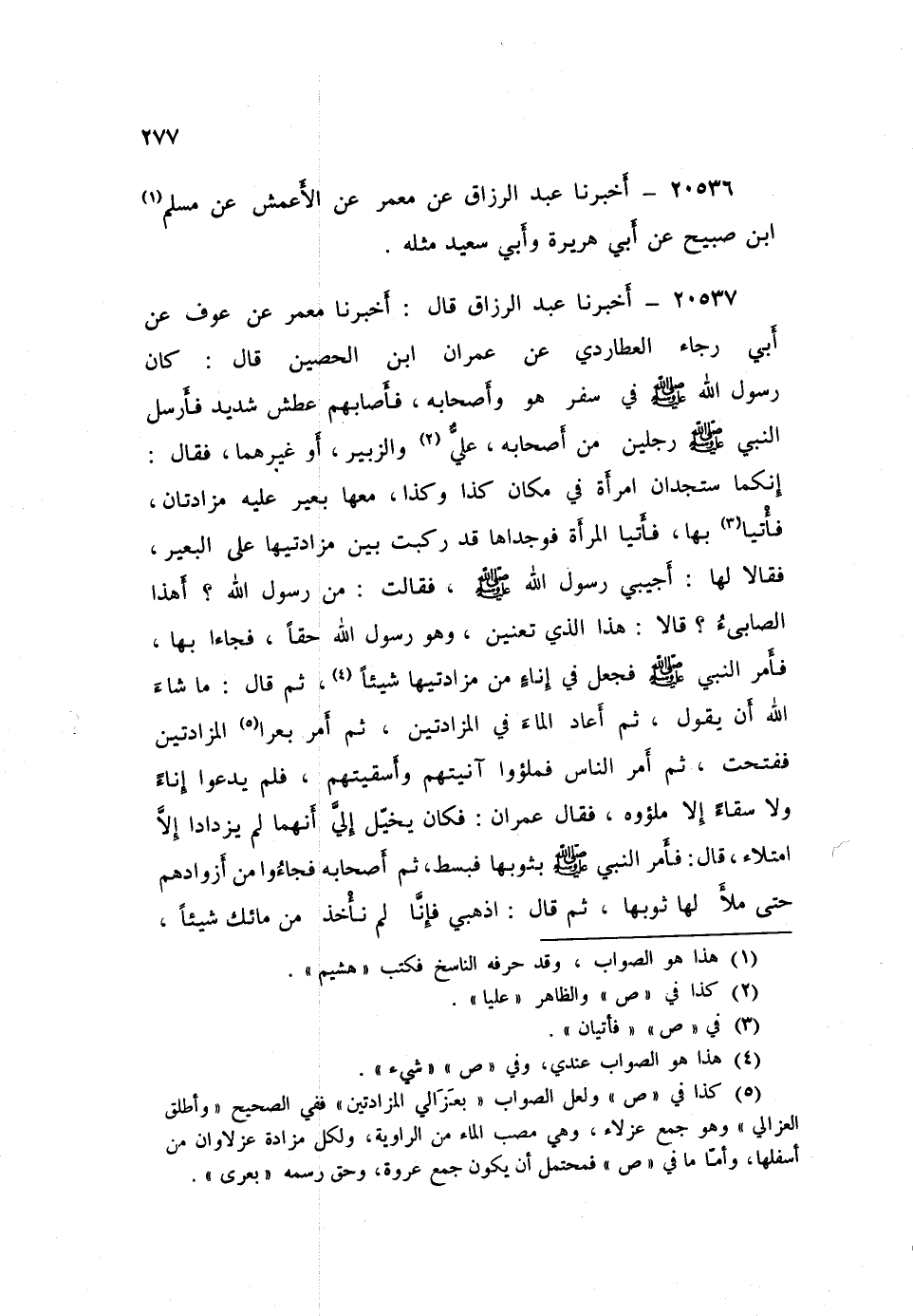 ٢٠٥٣٧ - أَخْبَرَنَا عَبْدُ الرَّزَّاقِ، قَالَ أَخْبَرَنَا مَعْمَرٌ، عَنْ عَوْفٍ، عَنْ أَبِي رَجَاءٍ الْعُطَارِدِيِّ، عَنْ عِمْرَانَ بْنِ الْحُصَيْنِ، قَالَ: كَانَ رَسُولُ اللَّهِ صَلَّى اللهُ عَلَيْهِ وَسَلَّمَ فِي سَفَرٍ هُوَ وَأَصْحَابُهُ فَأَصَابَهُمْ عَطَشٌ شَدِيدٌ، فَأَرْسَلَ النَّبِيُّ صَلَّى اللهُ عَلَيْهِ وَسَلَّمَ رَجُلَيْنِ مِنْ أَصْحَابِهِ - عَلِيٌّ وَالزُّبَيْرُ أَوْ غَيْرُهُمَا - فَقَالَ: «إِنَّكُمَا سَتَجِدَانِ امْرَأَةً فِي مَكَانِ كَذَا وَكَذَا مَعَهَا بَعِيرٌ عَلَيْهِ مَزَادَتَانِ، فَأْتِيَا بِهَا» ، فَأَتَيَا الْمَرْأَةَ، فَوجَدَاهَا قَدْ رَكِبَتْ بين مزادتيها عَلَى الْبَعِيرِ، فَقَالَا لَهَا: أَجِيبِي رَسُولَ اللَّهِ صَلَّى اللهُ عَلَيْهِ وَسَلَّمَ، فَقَالَتْ: مَنْ رَسُولُ اللَّهِ؟ أَهَذَا الصَّابِئُ؟ قَالَا: هَذَا الَّذِي تَعْنِينَ وَهُوَ رَسُولُ اللَّهِ حَقًّا، فَجَاءَا بِهَا، فَأَمَرَ النَّبِيُّ صَلَّى اللهُ عَلَيْهِ وَسَلَّمَ فَجَعَلَ فِي إِنَاءٍ مِنْ مُزَادَتَيْهَا شَيْئًا، ثُمَّ قَالَ مَا شَاءَ اللَّهُ أَنْ يَقُولَ، ثُمَّ أَعَادَ الْمَاءَ فِي الْمَزَادَتَيْنِ، ثُمَّ أَمَرَ بِعُرَى الْمَزَادَتَيْنِ فَفُتِحَتْ، ثُمَّ أَمَرَ النَّاسَ فَمَلَئُوا آنِيَتَهُمْ وَأسْقِيتَهُمْ، فَلَمْ يَدَعُوا إِنَاءً وَلَا سِقَاءً إِلَّا مَلَئُوهُ، فَقَالَ عِمْرَانُ: فَكَانَ يُخَيَّلُ إِلَيَّ أَنَّهُمَا لَمْ يَزْدَادَا إِلَّا امْتِلَاءً، قَالَ: فَأَمَرَ النَّبِيُّ صَلَّى اللهُ عَلَيْهِ وَسَلَّمَ بِثَوْبِهَا فَبُسِطَ، ثُمَّ أَصْحَابَهُ، فَجَاءُوا مِنْ أَزْوَادِهِمْ حَتَّى مَلَأَ لَهَا ثَوْبَهَا، ثُمَّ قَالَ: «اذْهَبِي فَإِنَّا لَمْ نَأْخُذْ مِنْ مَائِكَ شَيْئًا، ⦗٢٧٨⦘ وَلَكِنَّ اللَّهَ سَقَانَا» ، فَجَاءَتْ أَهْلَهَا، فَأَخْبَرَتْهُمْ، فَقَالَتْ: جِئْتُكُمْ مِنْ عِنْدِ أَسْحَرَ النَّاسِ، أَوْ إِنَّهُ لِرَسُولُ اللَّهِ حَقًّا، قَالَ: فَجَاءَ أَهْلُ ذَلِكَ الْحَيِّ فَأَسْلَمُوا كُلُّهُمْ