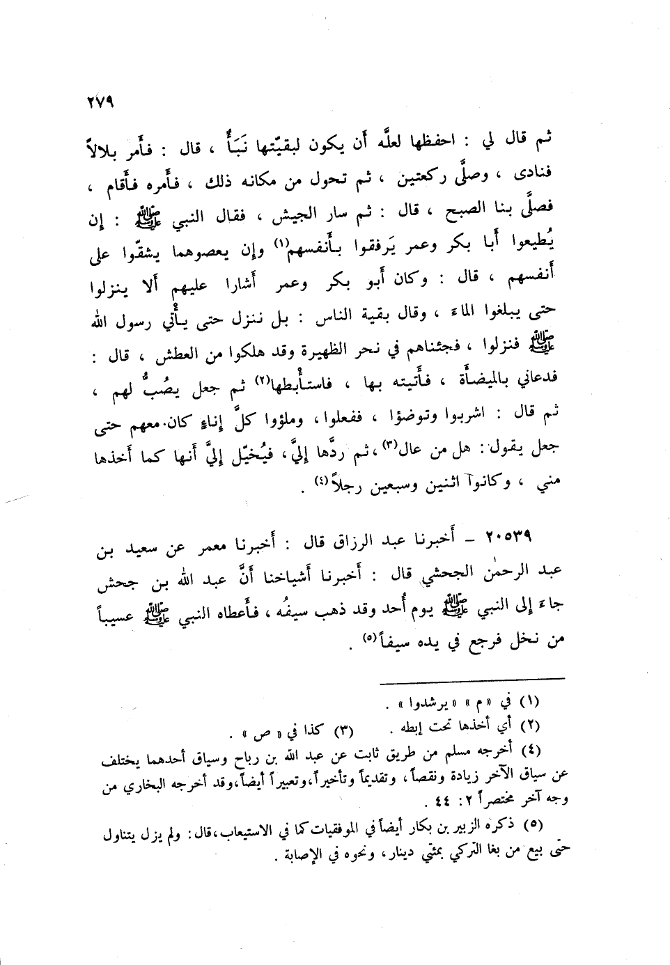 ٢٠٥٣٩ - أَخْبَرَنَا عَبْدُ الرَّزَّاقِ، قَالَ أَخْبَرَنَا مَعْمَرٌ، عَنْ سَعِيدِ بْنِ عَبْدِ الرَّحْمَنِ الْجَحْشِيِّ، قَالَ: أَخْبَرَنَا أَشْيَاخُنَا، «أَنَّ عَبْدَ اللَّهِ بْنَ جَحْشٍ جَاءَ إِلَى النَّبِيِّ صَلَّى اللهُ عَلَيْهِ وَسَلَّمَ يَوْمَ أُحُدٍ وَقَدْ ذَهَبَ سَيْفُهُ، فَأَعْطَاهُ النَّبِيُّ صَلَّى اللهُ عَلَيْهِ وَسَلَّمَ عَسِيبًا مِنْ نَخْلٍ، فَرَجَعَ فِي يَدِهِ سَيْفًا»