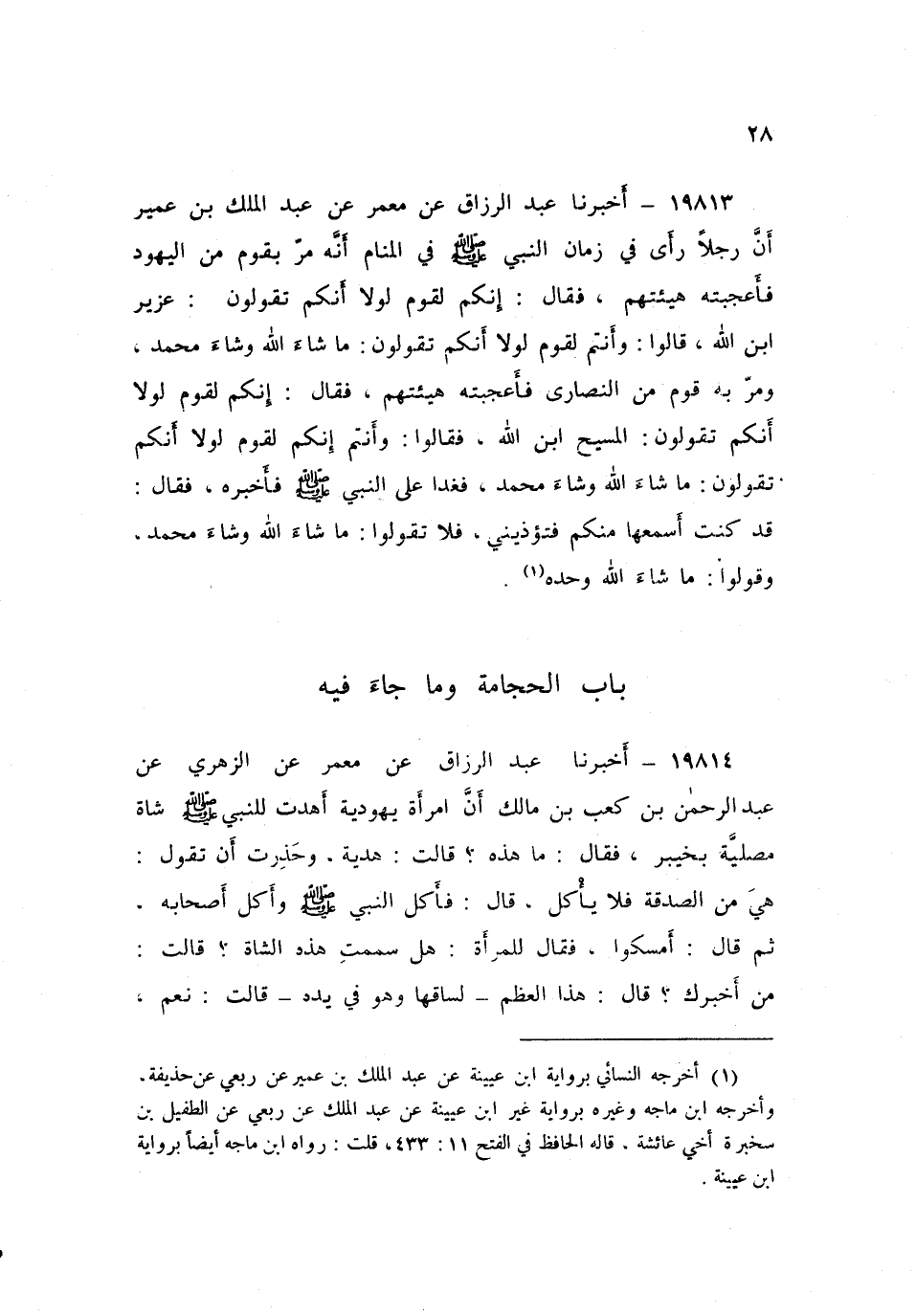 ١٩٨١٣ - أَخْبَرَنَا عَبْدُ الرَّزَّاقِ، قَالَ: أَخْبَرَنَا مَعْمَرٌ، عَنْ عَبْدِ الْمَلِكِ بْنِ عُمَيْرٍ، أَنَّ رَجُلًا رَأَى فِي زَمَانِ النَّبِيِّ صَلَّى اللهُ عَلَيْهِ وَسَلَّمَ فِي الْمَنَامِ: أَنَّهُ مَرَّ بِقَوْمٍ مِنَ الْيَهُودِ فَأَعْجَبَتْهُ هَيْئَتُهُمْ، فَقَالَ: إِنَّكُمْ لَقَوْمٌ لَوْلَا أَنَّكُمْ تَقُولُونَ: عُزَيْرٌ ابْنُ اللَّهِ، قَالُوا: وَأَنْتُمْ لَقَوْمٌ لَوْلَا أَنَّكُمْ تَقُولُونَ: مَا شَاءَ اللَّهُ، وَشَاءَ مُحَمَّدٌ، وَمَرَّ بِهِ قَوْمٌ مِنَ النَّصَارَى فَأَعْجَبَتْهُ هَيْئَتُهُمْ، فَقَالَ: إِنَّكُمْ لَقَوْمٌ لَوْلَا أَنَّكُمْ تَقُولُونَ: الْمَسِيحُ ابْنُ اللَّهِ، فَقَالُوا: وَأَنْتُمْ إِنَّكُمْ لَقَوْمٌ لَوْلَا أَنَّكُمْ تَقُولُونَ: مَا شَاءَ اللَّهُ، وَشَاءَ مُحَمَّدٌ فَغَدَا عَلَى النَّبِيِّ صَلَّى اللهُ عَلَيْهِ وَسَلَّمَ فَأَخْبَرَهُ، فَقَالَ: قَدْ كُنْتُ أَسْمَعُهَا مِنْكُمْ فتُؤذِينِي، فَلَا تَقُولُوا: مَا شَاءَ اللَّهُ وَشَاءَ مُحَمَّدٌ، وَقُولُوا: مَا شَاءَ اللَّهُ وَحْدَهُ "