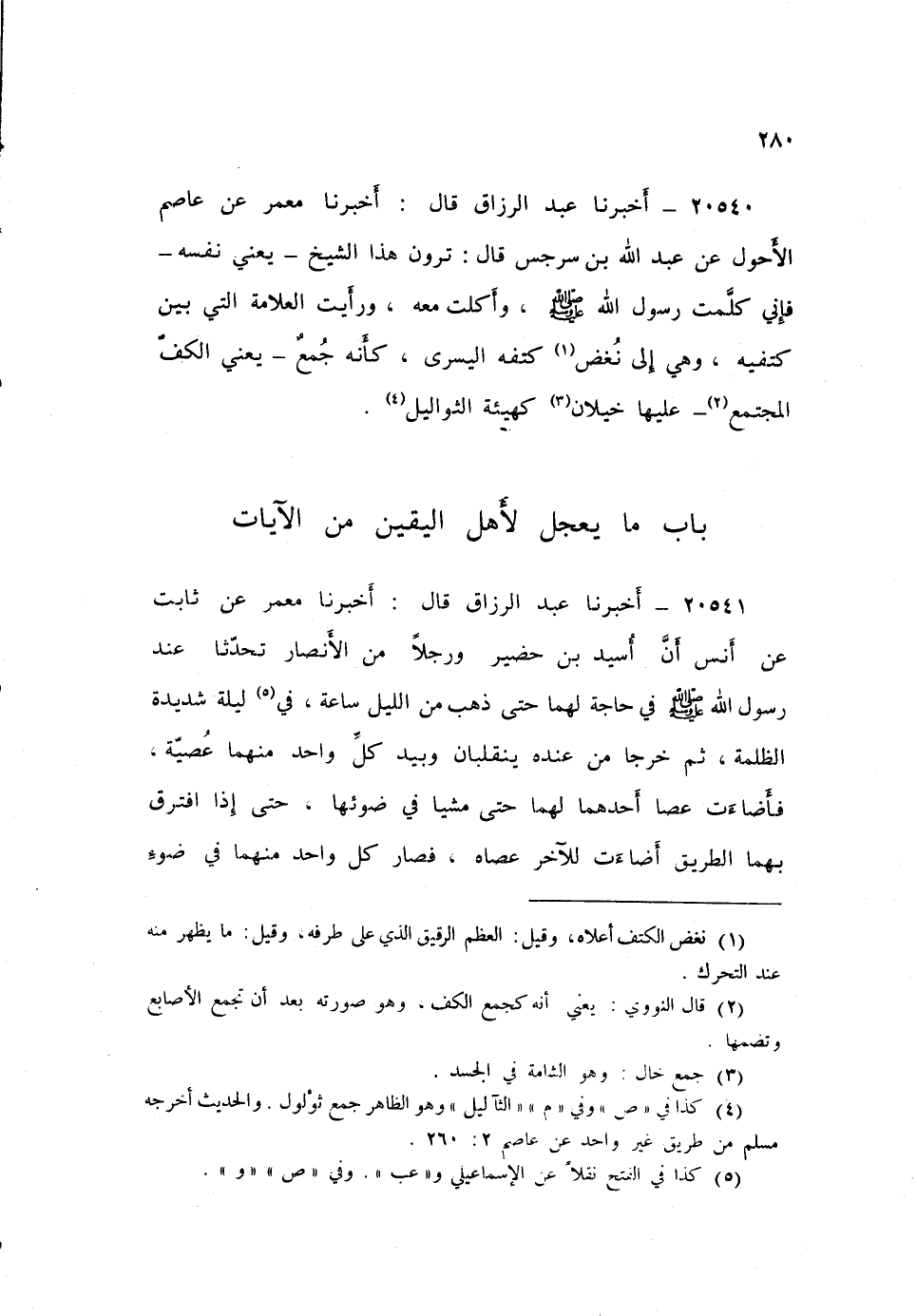 ٢٠٥٤١ - أَخْبَرَنَا عَبْدُ الرَّزَّاقِ، قَالَ أَخْبَرَنَا مَعْمَرٌ، عَنْ ثَابِتٍ، عَنْ أَنَسٍ، «أَنَّ أُسَيْدَ بْنَ حُضَيْرٍ وَرَجُلًا مِنَ الْأَنْصَارِ تَحَدَّثَا عِنْدَ رَسُولِ اللَّهِ صَلَّى اللهُ عَلَيْهِ وَسَلَّمَ فِي حَاجَةٍ لَهُمَا، حَتَّى ذَهَبَ مِنَ اللَّيْلِ سَاعَةٌ فِي لَيْلَةٍ شَدِيدَةِ الظُّلْمَةِ، ثُمَّ خَرَجَا مِنْ عِنْدِهِ يَنْقَلِبَانِ، وَبِيَدِ كُلِّ وَاحِدٍ مِنْهُمَا عُصَيَّةٌ، فَأَضَاءَتْ عَصَا أَحَدِهِمَا لَهُمَا حَتَّى مَشَيَا فِي ضَوْئِهَا، حَتَّى إِذَا افْتَرَقَ بِهِمَا الطَّرِيقُ أَضَاءَتْ لِلْآخَرِ عَصَاهُ، فَسَارَ كُلُّ وَاحِدٍ مِنْهُمَا فِي ضَوْءِ عَصَاهُ حَتَّى بَلَغَ أَهْلَهُ»