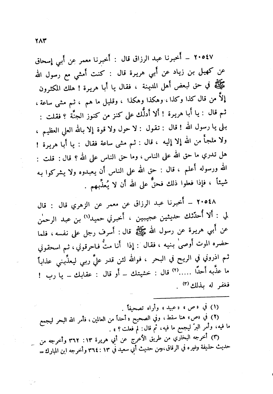 ٢٠٥٤٧ - أَخْبَرَنَا عَبْدُ الرَّزَّاقِ، قَالَ أَخْبَرَنَا مَعْمَرٌ، عَنْ أَبِي إِسْحَاقَ، عَنْ كُهَيْلِ بْنِ زِيَادٍ، عَنْ أَبِي هُرَيْرَةَ، قَالَ: كُنْتُ أَمْشِي مَعَ رَسُولِ اللَّهِ صَلَّى اللهُ عَلَيْهِ وَسَلَّمَ فِي حَقٍّ لِبَعْضِ أَهْلِ الْمَدِينَةِ، فَقَالَ: «يَا أَبَا هُرَيْرَةَ، هَلَكَ الْمُكْثِرُونَ إِلَّا مَنْ قَالَ: كَذَا وَكَذَا، وَهَكَذَا وَهَكَذَا، وَقَلِيلٌ مَا هُمْ» ، ثُمَّ مَشَى سَاعَةً، ثُمَّ قَالَ: «يَا أَبَا هُرَيْرَةَ، أَلَا أَدُلُّكَ عَلَى كَنْزٍ مِنْ كُنُوزِ الْجَنَّةِ؟» ، فَقُلْتُ: بَلَى يَا رَسُولَ اللَّهِ، قَالَ: «تَقُولُ: لَا حَوْلَ وَلَا قُوَّةَ إِلَّا بِاللَّهِ الْعَلِيِّ الْعَظِيمِ، وَلَا مَلْجَأَ مِنَ اللَّهِ إِلَّا إِلَيْهِ» ، قَالَ: ثُمَّ مَشَى سَاعَةً فَقَالَ: «يَا أَبَا هُرَيْرَةَ، هَلْ تَدْرِي مَا حَقُّ اللَّهِ عَلَى النَّاسِ، وَمَا حَقُّ النَّاسِ عَلَى اللَّهِ؟» ، قَالَ: قُلْتُ: اللَّهُ وَرَسُولُهُ أَعْلَمُ قَالَ: «حَقُّ اللَّهِ عَلَى النَّاسِ أَنْ يَعْبُدُوهُ وَلَا يُشْرِكُوا بِهِ شَيْئًا، فَإِذَا فَعَلُوا ذَلِكَ فَحَقٌّ عَلَى اللَّهِ أَنْ لَا يُعَذِّبَهُمْ»