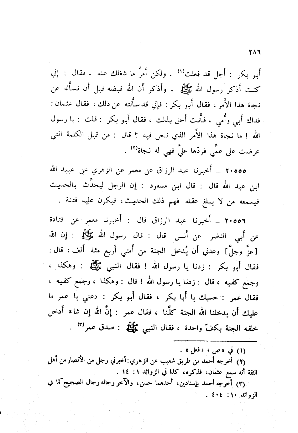 ٢٠٥٥٦ - أَخْبَرَنَا عَبْدُ الرَّزَّاقِ، قَالَ أَخْبَرَنَا مَعْمَرٌ، عَنْ قَتَادَةَ، عَنْ أَبِي النَّضْرِ، عَنْ أَنَسٍ، قَالَ: قَالَ رَسُولُ اللَّهِ صَلَّى اللهُ عَلَيْهِ وَسَلَّمَ: «إِنَّ اللَّهَ عَزَّ وَجَلَّ وَعَدَنِي أَنْ يُدْخِلَ الْجَنَّةَ مِنْ أُمَّتِي أَرْبَعَ مِائَةِ أَلْفٍ» قَالَ: فَقَالَ أَبُو بَكْرٍ: زِدْنَا يَا رَسُولَ اللَّهِ، فَقَالَ النَّبِيُّ صَلَّى اللهُ عَلَيْهِ وَسَلَّمَ: «وَهَكَذَا» ، وَجَمَعَ كَفَّيْهِ، قَالَ: زِدْنَا يَا رَسُولَ اللَّهِ، قَالَ: «وَهَكَذَا» ، وَجَمَعَ كَفَّيْهِ، فَقَالَ عُمَرُ: حَسْبُكَ يَا أَبَا بَكْرٍ، فَقَالَ أَبُو بَكْرٍ: دَعْنِي يَا عُمَرُ مَا عَلَيْكَ أَنْ يُدْخِلَنَا اللَّهُ الْجَنَّةَ كُلَّنَا، فَقَالَ عُمَرُ: إِنَّ اللَّهَ إِنْ شَاءَ أَدْخَلَ خَلْقَهُ الْجَنَّةَ بِكَفٍّ وَاحِدَةٍ، فَقَالَ النَّبِيُّ صَلَّى اللهُ عَلَيْهِ وَسَلَّمَ: «صَدَقَ عُمَرُ»