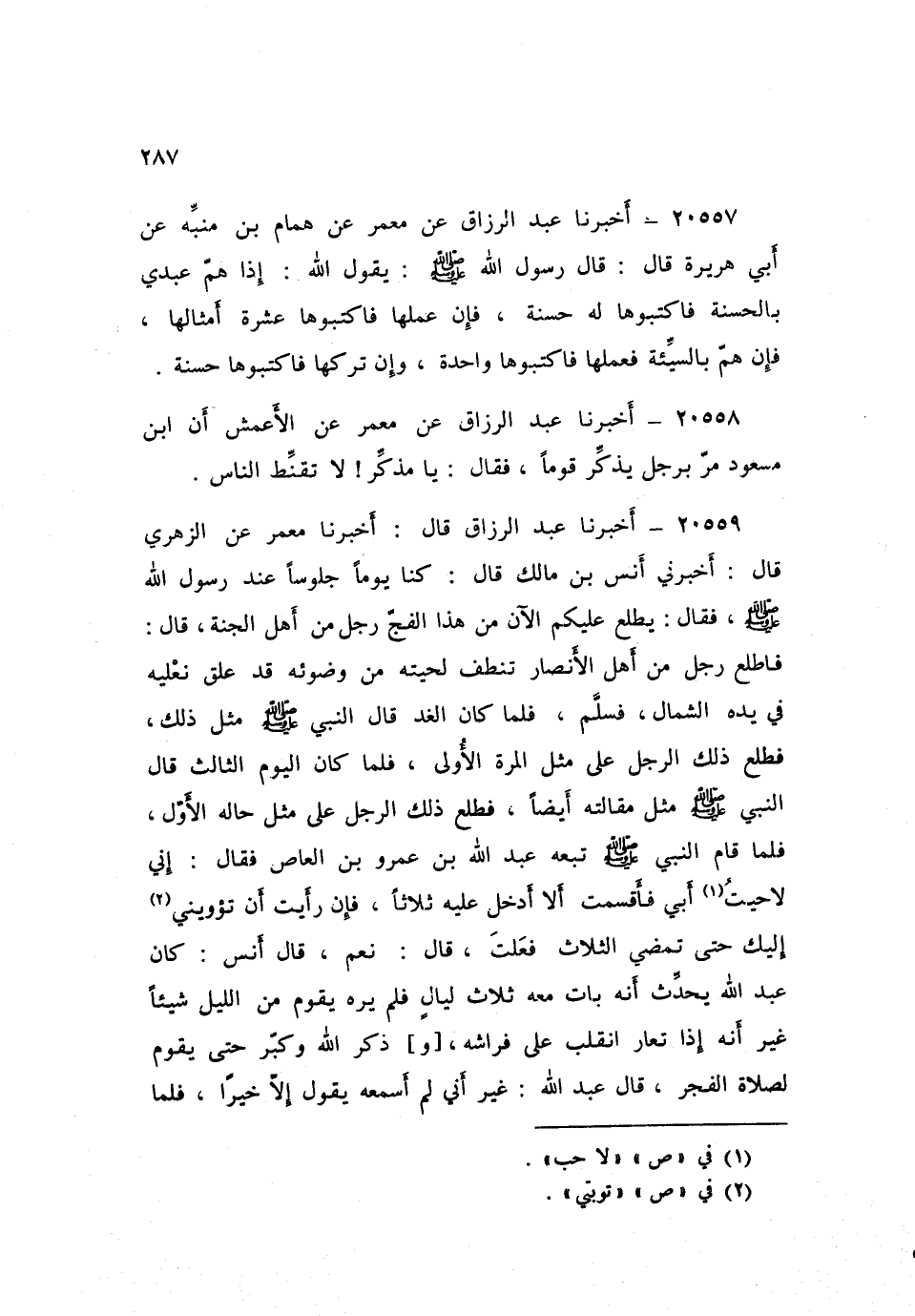٢٠٥٥٩ - أَخْبَرَنَا عَبْدُ الرَّزَّاقِ، قَالَ أَخْبَرَنَا مَعْمَرٌ، عَنِ الزُّهْرِيِّ، قَالَ: أَخْبَرَنِي أَنَسُ بْنُ مَالِكٍ، قَالَ: كُنَّا يَوْمًا جُلُوسًا عِنْدَ رَسُولِ اللَّهِ صَلَّى اللهُ عَلَيْهِ وَسَلَّمَ فَقَالَ: «يَطْلُعُ عَلَيْكُمُ الْآنَ مِنْ هَذَا الْفَجِّ رَجُلٌ مِنْ أَهْلِ الْجَنَّةِ» ، قَالَ: فَطَلَعَ رَجُلٌ مِنْ أَهْلِ الْأَنْصَارِ تَنْطِفُ لِحْيَتُهُ مِنْ وُضُوئِهِ، قَدْ عَلَّقَ نَعْلَيْهِ فِي يَدِهِ الشِّمَالِ فَسَلَّمَ، فَلَمَّا كَانَ الْغَدُ، قَالَ النَّبِيُّ صَلَّى اللهُ عَلَيْهِ وَسَلَّمَ مِثْلَ ذَلِكَ، فَطَلَعَ ذَلِكَ الرَّجُلُ عَلَى مِثْلِ الْمَرَّةِ الْأُولَى، فَلَمَّا كَانَ الْيَوْمُ الثَّالِثُ، قَالَ النَّبِيُّ صَلَّى اللهُ عَلَيْهِ وَسَلَّمَ مِثْلَ مَقَالَتِهِ أَيْضًا، فَطَلَعَ ذَلِكَ الرَّجُلُ عَلَى مِثْلِ حَالِهِ الْأَوَّلِ، فَلَمَّا قَامَ النَّبِيُّ صَلَّى اللهُ عَلَيْهِ وَسَلَّمَ تَبِعَهُ عَبْدُ اللَّهِ بْنُ عَمْرِو بْنِ الْعَاصِ فَقَالَ: إِنِّي لَاحَيْتُ أَبِي، فَأَقْسَمْتُ أَلَّا أَدْخُلَ عَلَيْهِ ثَلَاثًا، فَإِنْ رَأَيْتَ أَنْ تُؤْوِيَنِي إِلَيْكَ حَتَّى تَمْضِيَ الثَّلَاثُ فَعَلْتَ، قَالَ: نَعَمْ، قَالَ أَنَسٌ: كَانَ عَبْدُ اللَّهِ يُحَدِّثُ أَنَّهُ بَاتَ مَعَهُ ثَلَاثَ لَيَالٍ، فَلَمْ يَرَهُ يَقُومُ مِنَ اللَّيْلِ شَيْئًا، غَيْرَ أَنَّهُ إِذَا تَعَارَّ انْقَلَبَ عَلَى فِرَاشِهِ، وَذَكَرَ اللَّهَ وَكَبَّرَ حَتَّى يَقُومَ لِصَلَاةِ الْفَجْرِ، قَالَ عَبْدُ اللَّهِ: غير أَنِّي لَمْ أَسْمَعْهُ يَقُولُ إِلَّا خَيْرًا، فَلَمَّا ⦗٢٨٨⦘ مَضَتِ الثَّلَاثُ، وَكِدْتُ أَحْتَقِرُ عَمَلَهُ، قُلْتُ: يَا عَبْدَ اللَّهِ، لَمْ يَكُنْ بَيْنِي وَبَيْنَ وَالِدِي هِجْرَةٌ وَلَا غَضَبٌ، وَلَكِنِّي سَمِعْتُ رَسُولَ اللَّهِ صَلَّى اللهُ عَلَيْهِ وَسَلَّمَ يَقُولُ ثَلَاثَ مَرَّاتٍ: «يَطْلُعُ الْآنَ عَلَيْكُمْ رَجُلٌ مِنْ أَهْلِ الْجَنَّةِ» ، فَطَلَعْتَ ثَلَاثَ مَرَّاتٍ، فَأَرَدْتُ أَنْ آوِيَ إِلَيْكَ لَأَنْظُرَ مَا عَمَلُكَ، فَأَقْتَدِيَ بِكَ، فَلَمْ أَرَكَ تَعْمَلُ كَبِيرَ عَمَلٍ، فَمَا الَّذِي بَلَغَ بِكَ مَا قَالَ رَسُولُ اللَّهِ صَلَّى اللهُ عَلَيْهِ وَسَلَّمَ؟ قَالَ: مَا هُوَ إِلَّا مَا رَأَيْتَ قَالَ: فَانْصَرَفْتُ عَنْهُ، فَلَمَّا وَلَّيْتُ دَعَانِي فَقَالَ: مَا هُوَ إِلَّا مَا رَأَيْتَ، غَيْرَ أَنِّي لَا أَجِدُ فِي نَفْسِي عَلَى أَحَدٍ مِنَ الْمُسْلِمِينَ غِشًّا، وَلَا أَحْسُدُهُ عَلَى مَا أَعْطَاهُ اللَّهُ إِيَّاهُ إِلَيْهِ، فَقَالَ عَبْدُ اللَّهِ: هَذِهِ الَّتِي بَلَغَتْ بِكَ هِيَ الَّتِي لَا نُطِيقُ