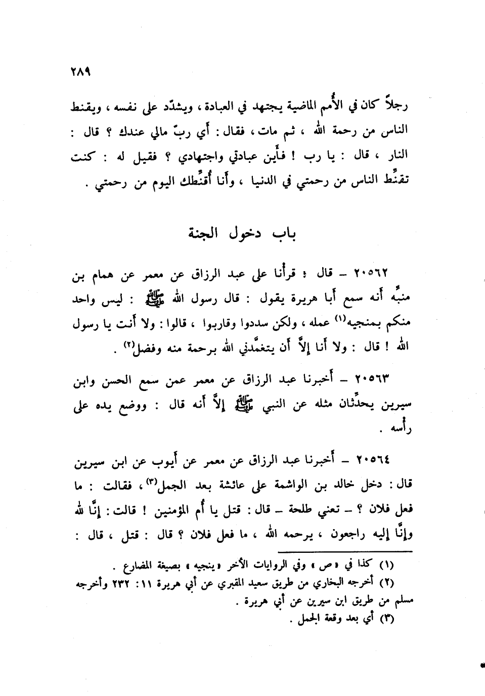 ٢٠٥٦٢ - قَالَ: قَرَأْنَا عَلَى عَبْدِ الرَّزَّاقِ، عَنْ مَعْمَرٍ، عَنْ هَمَّامِ بْنِ مُنَبِّهٍ، أَنَّهُ سَمِعَ أَبَا هُرَيْرَةَ يَقُولُ: قَالَ رَسُولُ اللَّهِ صَلَّى اللهُ عَلَيْهِ وَسَلَّمَ: «لَيْسَ وَاحِدٌ مِنْكُمْ بِمُنْجِيهِ عَمَلُهُ، وَلَكِنْ سَدِّدُوا وَقَارِبُوا» ، قَالُوا: وَلَا أَنْتَ يَا رَسُولَ اللَّهِ؟ قَالَ: «وَلَا أَنَا إِلَّا أَنْ يَتَغَمَّدَنِي اللَّهُ بِرَحْمَةٍ مِنْهُ وَفَضْلٍ» .،