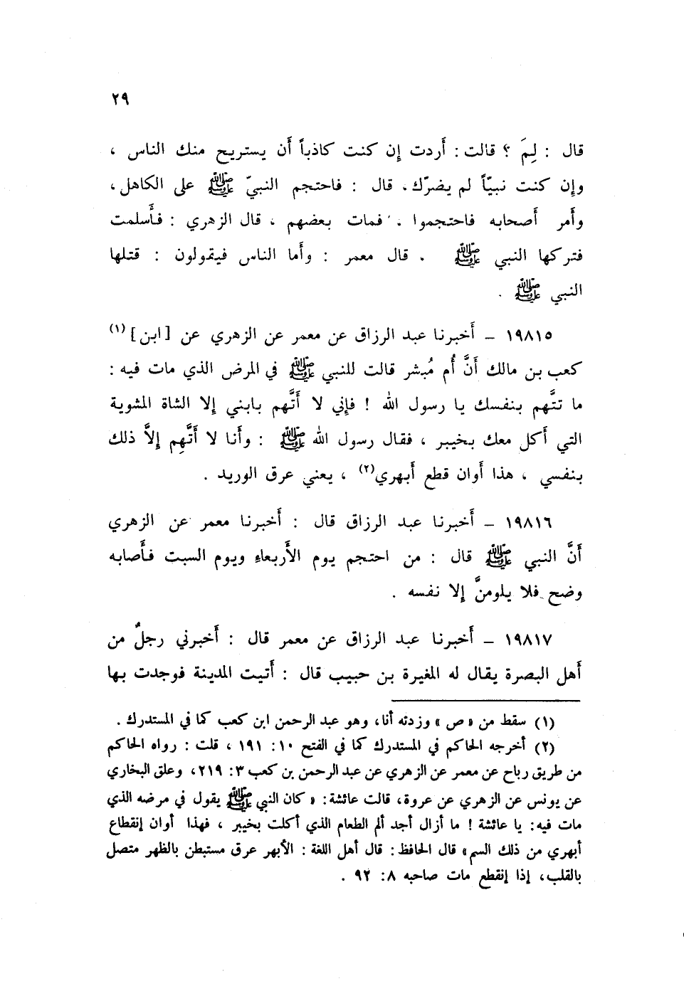 ١٩٨١٥ - أَخْبَرَنَا عَبْدُ الرَّزَّاقِ، عَنْ مَعْمَرٍ، عَنِ الزُّهْرِيِّ، عَنِ ابْنِ كَعْبِ بْنِ مَالِكٍ، أَنَّ أُمَّ مُبَشِّرٍ، قَالَتْ لِلنَّبِيِّ صَلَّى اللهُ عَلَيْهِ وَسَلَّمَ فِي الْمَرَضِ الَّذِي مَاتَ فِيهِ: مَا تَتَّهِمُ بِنَفْسِكَ يَا رَسُولَ اللَّهِ، فَإِنِّي لَا أَتَّهِمُ بِابْنِي إِلَّا الشَّاةَ الْمَشْوِيَّةَ الَّتِي أَكَلَ مَعَكَ بِخَيْبَرَ، فَقَالَ رَسُولُ اللَّهِ صَلَّى اللهُ عَلَيْهِ وَسَلَّمَ: «وَأَنَا لَا أَتَّهِمُ إِلَّا ذَلِكَ بِنَفْسِي، هَذَا أَوَانُ قَطْعِ أَبْهَرِي» يَعْنِي عِرْقَ الْوَرِيدِ