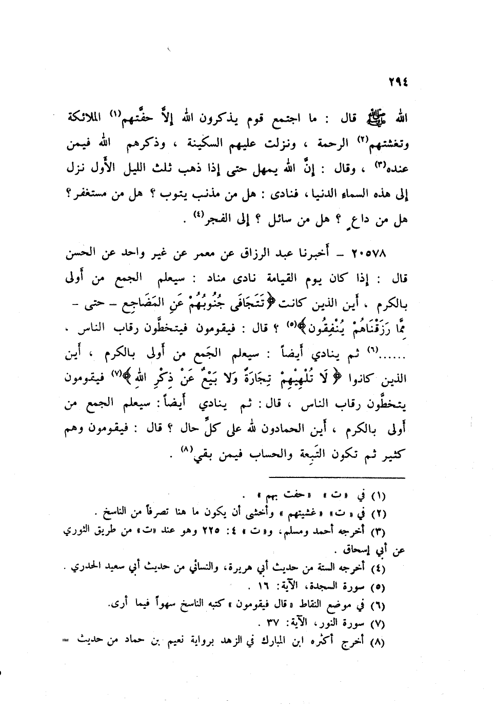 ٢٠٥٧٨ - أَخْبَرَنَا عَبْدُ الرَّزَّاقِ، عَنْ مَعْمَرٍ، عَنْ غَيْرِ وَاحِدٍ، عَنِ الْحَسَنِ، قَالَ: «إِذَا كَانَ يَوْمُ الْقِيَامَةِ نَادَى مُنَادٍ: سَيَعْلَمُ الْجَمْعُ مَنْ أَوْلَى بِالْكَرَمِ، أَيْنَ الَّذِينَ كَانَتْ: تَتَجَافَى جُنُوبُهُمْ عَنِ الْمَضَاجِعِ - حَتَّى - {مِمَّا رَزَقْنَاهُمْ يُنْفِقُونَ} [البقرة: ٣] ، قَالَ: فَيَقُومُونَ فَيتَخَطَّوْنَ رِقَابَ النَّاسِ، ثُمَّ يُنَادِي أَيْضًا: سَيَعْلَمُ الْجَمْعُ مَنْ أَوْلَى بِالْكَرَمِ، أَيْنَ الَّذِينَ كَانُوا: {لَا تُلْهِيهِمْ تِجَارَةٌ وَلَا بَيْعٌ عَنْ ذِكْرِ اللَّهِ} [النور: ٣٧] ، فَيَقُومُونَ يَتَخَطَّوْنَ رِقَابَ النَّاسِ، قَالَ: ثُمَّ يُنَادِي أَيْضًا: سَيُعْلَمُ الْجَمْعُ مَنْ أَوْلَى بِالْكَرَمِ: أَيْنَ الْحَمَّادُونَ لِلَّهِ عَلَى كُلِّ حَالٍ، قَالَ: فَيَقُومُونَ وَهُمْ كَثِيرٌ، ثُمَّ تَكُونُ التَّبِعَةُ، وَالْحِسَابُ فِيمَنْ بَقِيَ»