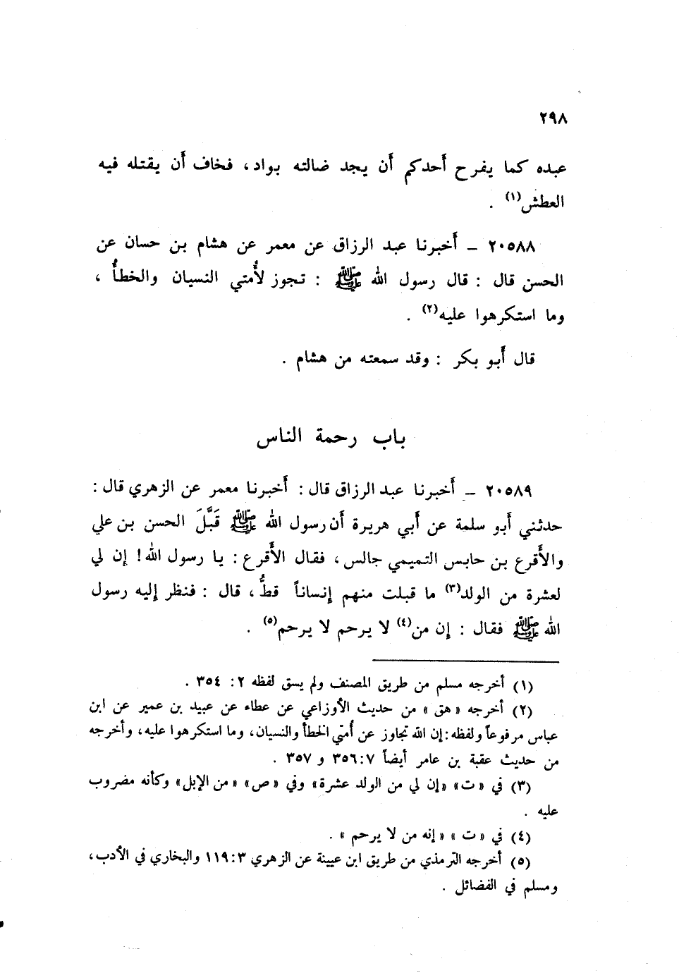 ٢٠٥٨٩ - أَخْبَرَنَا عَبْدُ الرَّزَّاقِ، قَالَ أَخْبَرَنَا مَعْمَرٌ، عَنِ الزُّهْرِيِّ، قَالَ: حَدَّثَنِي أَبُو سَلَمَةَ، عَنْ أَبِي هُرَيْرَةَ: أَنَّ رَسُولَ اللَّهِ صَلَّى اللهُ عَلَيْهِ وَسَلَّمَ قَبَّلَ الْحَسَنَ بْنَ عَلِيٍّ، وَالْأَقْرَعُ بْنُ حَابِسٍ التَّمِيمِيُّ جَالِسٌ، فَقَالَ الْأَقْرَعُ: يَا رَسُولَ اللَّهِ، إِنَّ لِي لَعَشْرَةً مِنَ الْوَلَدِ مَا قَبَّلْتُ مِنْهُمْ إِنْسَانًا قَطُّ، قَالَ: فَنَظَرَ إِلَيْهِ رَسُولُ اللَّهِ صَلَّى اللهُ عَلَيْهِ وَسَلَّمَ فَقَالَ: «إِنَّ مَنْ لَا يَرْحَمُ لَا يُرْحَمُ»