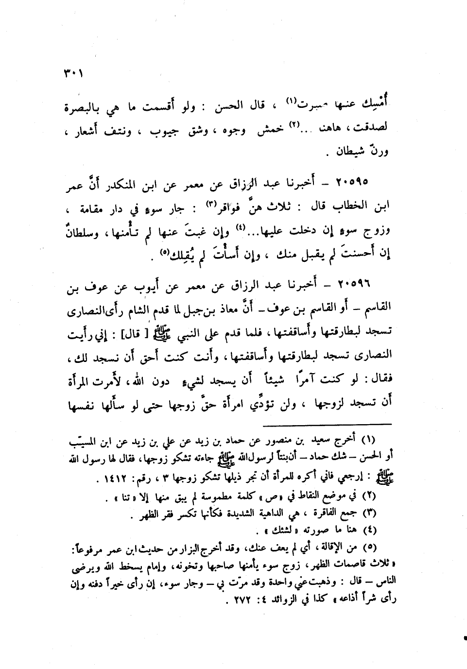 ٢٠٥٩٦ - أَخْبَرَنَا عَبْدُ الرَّزَّاقِ، عَنْ مَعْمَرٍ، عَنْ أَيُّوبَ، عَنْ عَوْفِ بْنِ الْقَاسِمِ أَوِ الْقَاسِمِ بْنِ عَوْفٍ - أَنَّ مُعَاذَ بْنَ جَبَلٍ، لَمَّا قَدِمَ الشَّامَ رَأَى النَّصَارَى تَسْجُدُ لِبَطَارِقَتِهَا، وَأَسَاقِفَتِهَا، فَلَمَّا قَدِمَ عَلَى النَّبِيِّ صَلَّى اللهُ عَلَيْهِ وَسَلَّمَ قَالَ: إِنِّي رَأَيْتُ النَّصَارَى تَسْجُدُ لِبَطَارِقَتِهَا، وَأَسَاقِفَتِهَا، وَأَنْتَ كُنْتَ أَحَقَّ أَنْ نَسْجُدَ لَكَ، فَقَالَ: «لَوْ كُنْتُ آمِرًا شَيْئًا أَنْ يَسْجُدَ لِشَيْءٍ دُونَ اللَّهِ، لَأَمَرْتُ الْمَرْأَةَ أَنْ تَسْجُدَ لِزَوْجِهَا، وَلَنْ تُؤَدِّيَ امْرَأَةٌ حَقَّ زَوْجِهَا، حَتَّى لَوْ سَأَلَهَا نَفْسَهَا وَهِيَ عَلَى قَتَبٍ لَمْ تَمْنَعْهُ نَفْسَهَا»