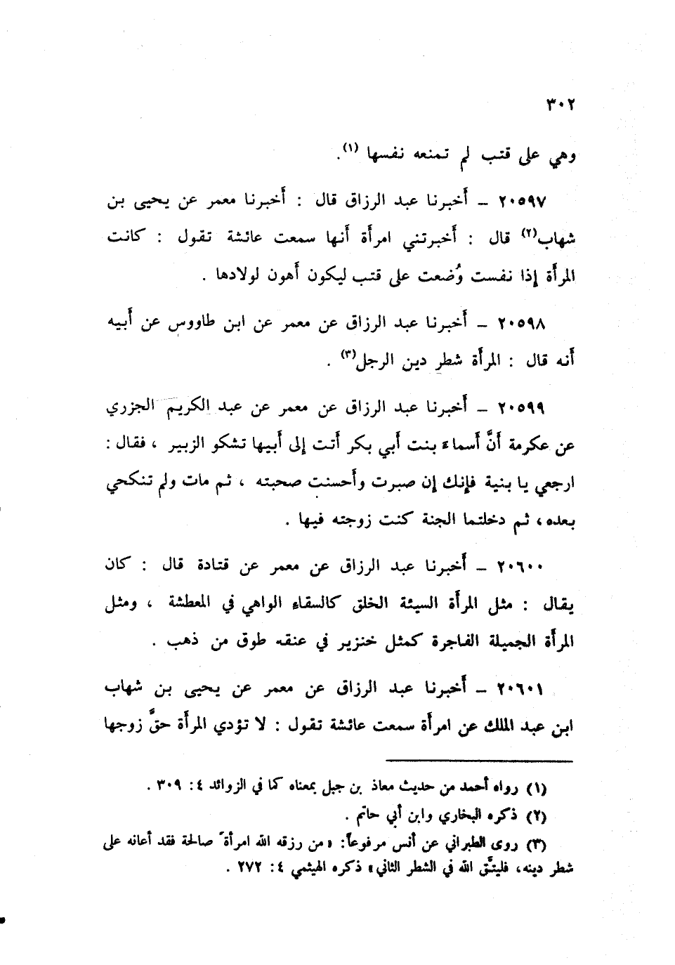 ٢٠٥٩٨ - أَخْبَرَنَا عَبْدُ الرَّزَّاقِ، عَنْ مَعْمَرٍ، عَنِ ابْنِ طَاوُسٍ، عَنْ أَبِيهِ، أَنَّهُ قَالَ: «الْمَرْأَةُ شَطْرُ دِينِ الرَّجُلِ»