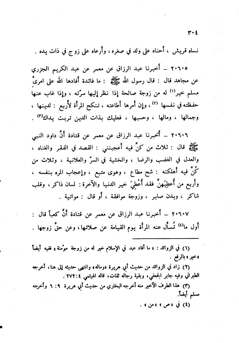 ٢٠٦٠٦ - أَخْبَرَنَا عَبْدُ الرَّزَّاقِ، عَنْ مَعْمَرٍ، عَنْ قَتَادَةَ، «أَنَّ دَاوُدَ النَّبِيَّ صَلَّى اللهُ عَلَيْهِ وَسَلَّمَ قَالَ: ثَلَاثٌ مَنْ كُنَّ فِيهِ أعَجَبْنَنِي: الْقَصْدُ فِي الْفَقْرِ وَالْغِنَاءِ، وَالْعَدْلُ فِي الْغَضَبِ وَالرِّضَا، وَالْخَشْيَةُ فِي السِّرِّ وَالْعَلَانِيَةِ، وَثَلَاثٌ مَنْ كُنَّ فِيهِ أهْلَكَتْهُ: شُحٌّ مُطَاعٌ، وَهَوًى مُتَّبَعٌ، وَإِعْجَابُ الْمَرْءِ بِنَفْسِهِ، وَأَرْبَعٌ مَنْ أُعْطِيَهُنَّ فَقَدْ أُعْطِيَ خَيْرَ الدُّنْيَا وَالْآخِرَةِ: لِسَانٌ ذَاكِرٌ، وَقَلَبٌ شَاكِرٌ، وَبَدَنٌ صَابِرٌ، وَزَوْجَةٌ مُوَافِقَةٌ - أَوْ قَالَ: مُوَاتِيَةٌ»