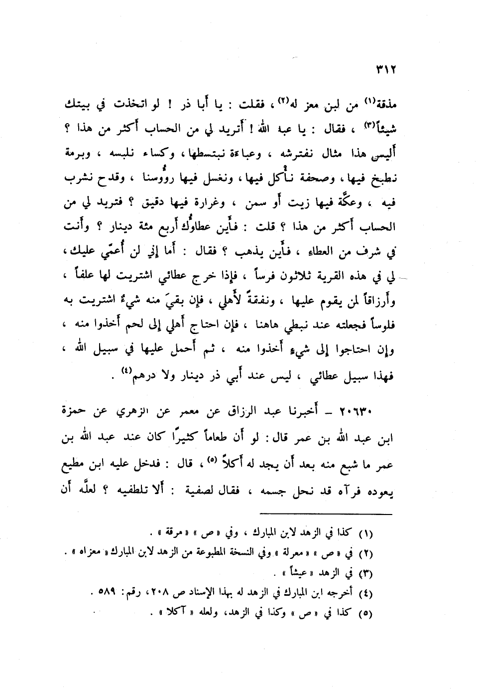 ٢٠٦٣٠ - أَخْبَرَنَا عَبْدُ الرَّزَّاقِ، عَنْ مَعْمَرٍ، عَنِ الزُّهْرِيِّ، عَنْ حَمْزَةَ بْنِ عَبْدِ اللَّهِ بْنِ عُمَرَ، قَالَ: لَوْ أَنَّ طَعَامًا كَثِيرًا كَانَ عِنْدَ عَبْدِ اللَّهِ بْنِ عُمَرَ مَا شَبِعَ مِنْهُ بَعْدَ أَنْ يَجِدَ لَهُ أَكْلًا، قَالَ: فَدَخَلَ عَلَيْهِ ابْنُ مُطِيعٍ يَعُودُهُ، فَرَآهُ قَدْ نَحَلَ جِسْمُهُ، فَقَالَ لِصَفِيَّةَ: أَلَا تُلَطِّفِيهِ لَعَلَّهُ أَنْ ⦗٣١٣⦘ يَرْتَدَّ إِلَيْهِ جِسْمُهُ، تَصْنَعِينَ لَهُ طَعَامًا، قَالَتْ: إِنَّا لَنَفْعَلُ ذَلِكَ، وَلَكِنَّهُ لَا يَدَعُ أَحَدًا مِنْ أَهْلِهِ، وَلَا مَنْ يَحْضُرُهُ إِلَّا دَعَاهُ عَلَيْهِ، فَكَلِّمْهُ أَنْتَ فِي ذَلِكَ، فَقَالَ لَهُ ابْنُ مُطِيعٍ: يَا أَبَا عَبْدِ الرَّحْمَنِ لَوِ اتَّخَذْتَ طَعَامًا يُرْجِعُ إِلَيْكَ جَسَدَكَ، فَقَالَ: «إِنَّهُ لَيَأْتِي عَلَيَّ ثَمَانِ سِنِينَ مَا أَشْبَعُ فِيهَا شَبْعَةً وَاحِدَةً - أَوْ قَالَ: لَا أَشْبَعُ فِيهَا إِلَّا شَبْعَةً وَاحِدَةً - فَالْآنَ تُرِيدُ أَنْ أَشْبَعَ حِينَ لَمْ يَبْقَ مِنْ عُمْرِي إِلَّا ظِمْءُ حِمَارٍ»