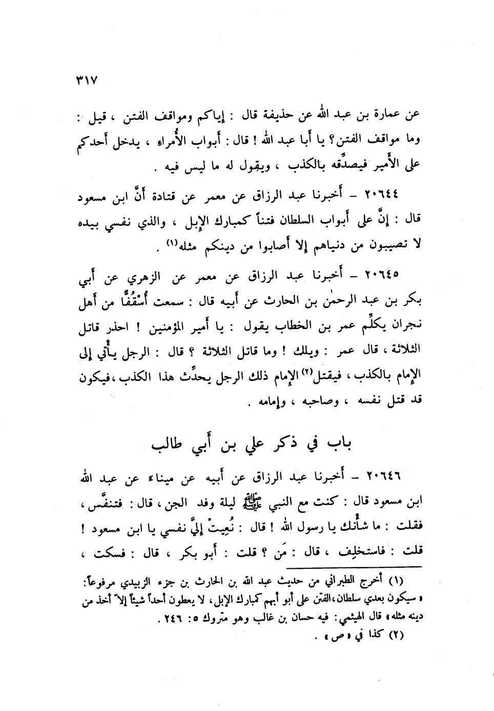 ٢٠٦٤٦ - أَخْبَرَنَا عَبْدُ الرَّزَّاقِ، عَنْ أَبِيهِ، عَنْ مِينَاءَ، عَنْ عَبْدِ اللَّهِ بْنِ مَسْعُودٍ، قَالَ: كُنْتُ مَعَ النَّبِيِّ صَلَّى اللهُ عَلَيْهِ وَسَلَّمَ لَيْلَةَ وَفْدِ الْجِنِّ، قَالَ: فَتَنَفَّسَ فَقُلْتُ: مَا شَأْنُكَ يَا رَسُولَ اللَّهِ؟ قَالَ: «نُعِيَتْ إِلَيَّ نَفْسِي يَا ابْنَ مَسْعُودٍ» قُلْتُ: فَاسْتَخْلِفْ، قَالَ: «مَنْ؟» ، قُلْتُ: أَبُو بَكْرٍ؟ قَالَ: فَسَكَتَ، ⦗٣١٨⦘ ثُمَّ مَضَى سَاعَةٌ، ثُمَّ تَنَفَّسَ، قَالَ: فَقُلْتُ: مَا شَأْنُكَ؟ قَالَ: «نُعِيَتْ إِلَيَّ نَفْسِي يَا ابْنَ مَسْعُودٍ» ، قَالَ: قُلْتُ: فَاسْتَخْلِفْ، قَالَ: «مَنْ؟» ، قُلْتُ: عُمَرُ، قَالَ: فَسَكَتَ، ثُمَّ مَضَى سَاعَةٌ ثُمَّ تَنَفَّسَ، قَالَ: فَقُلْتُ: مَا شَأْنُكَ؟ قَالَ: «نُعِيَتْ إِلَيَّ نَفْسِي يَا ابْنَ مَسْعُودٍ» ، قَالَ: قُلْتُ: فَاسْتَخْلِفْ، قَالَ: «مَنْ؟» ، قُلْتُ: عَلِيُّ بْنُ أَبِي طَالِبٍ، قَالَ: «أَمَا وَالَّذِي نَفْسِي بِيَدِهِ لَئِنْ أَطَاعُوهُ لَيَدْخُلُنَّ الْجَنَّةَ أَجْمَعِينَ أَكْتَعِينَ»
